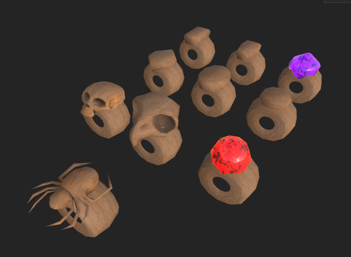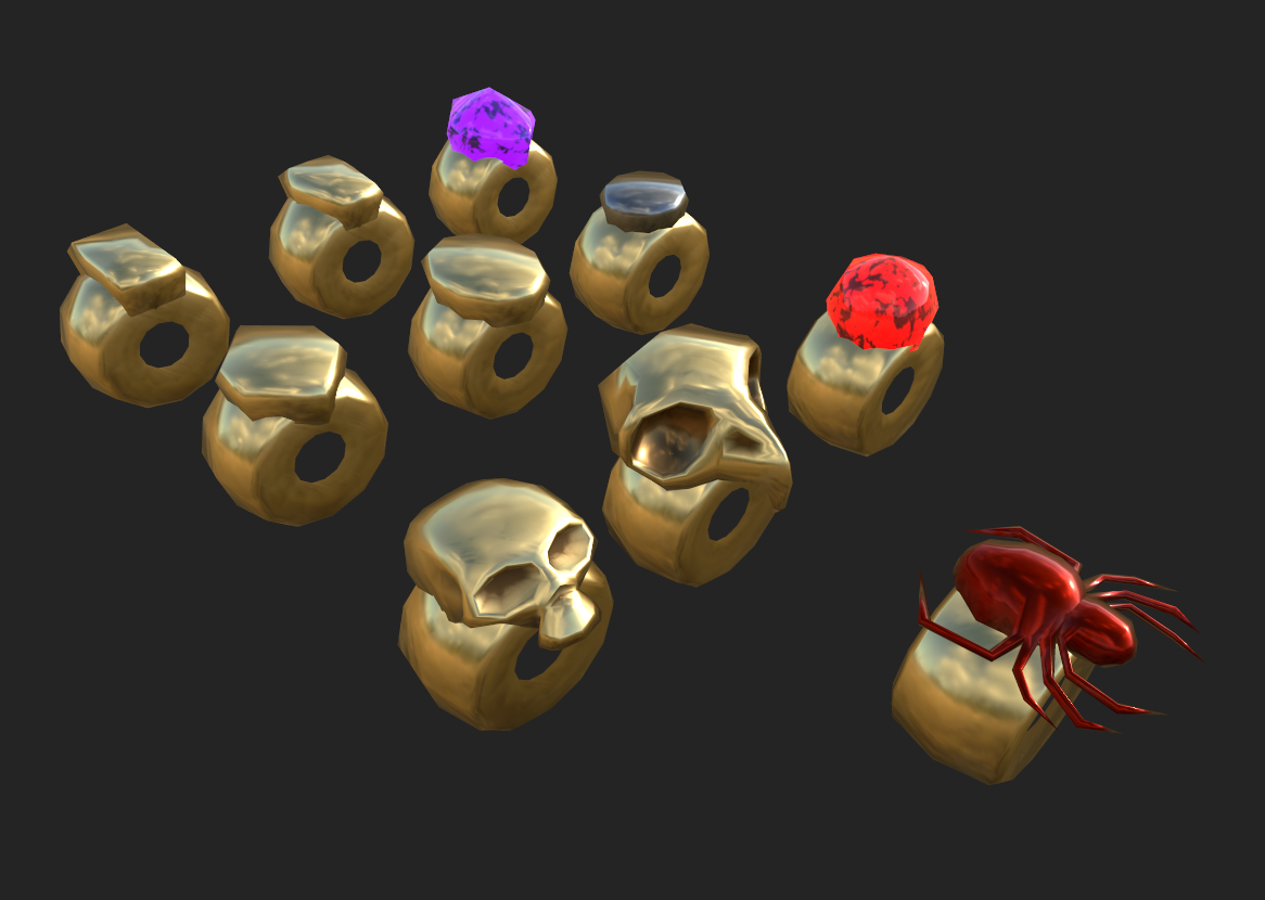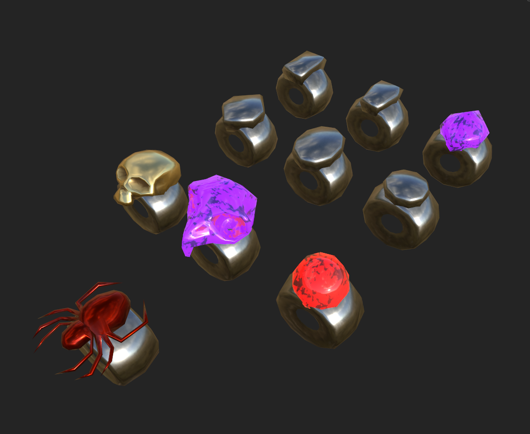 each ring comes with textures for Dark steel, Gold, Silver, wood, Red gem and Purple gem. Each of these can be used on every ring top and base and all are mix and match.