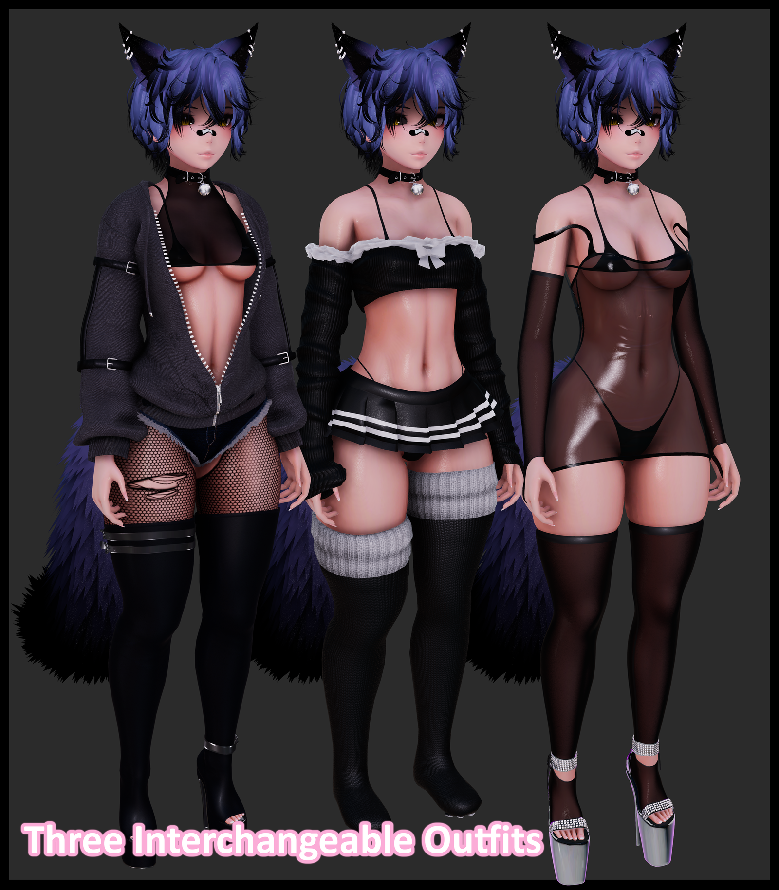 Everything else by me except for a few generic free use textures and normal maps where there were none originally like the skin and some fabrics, taken from a far corner of the internet years ago. Everything used from the VRChat creator sphere is credited.