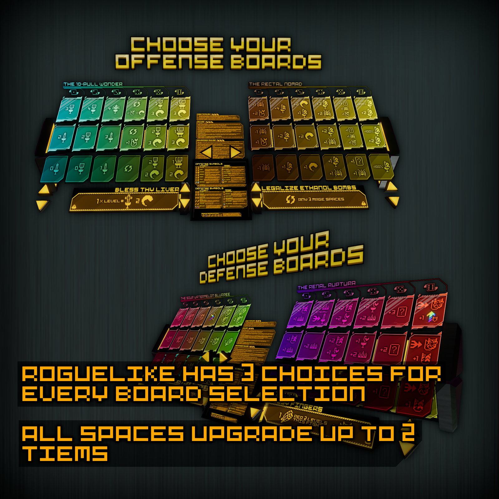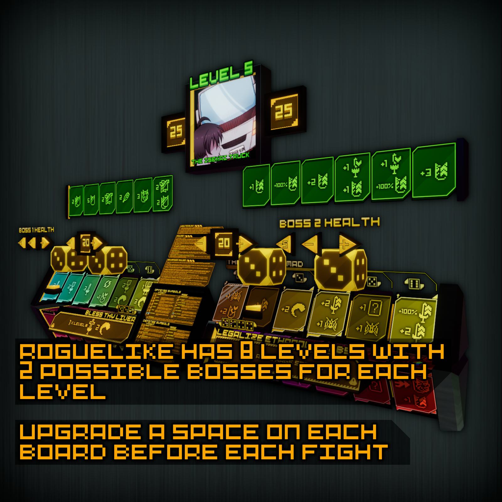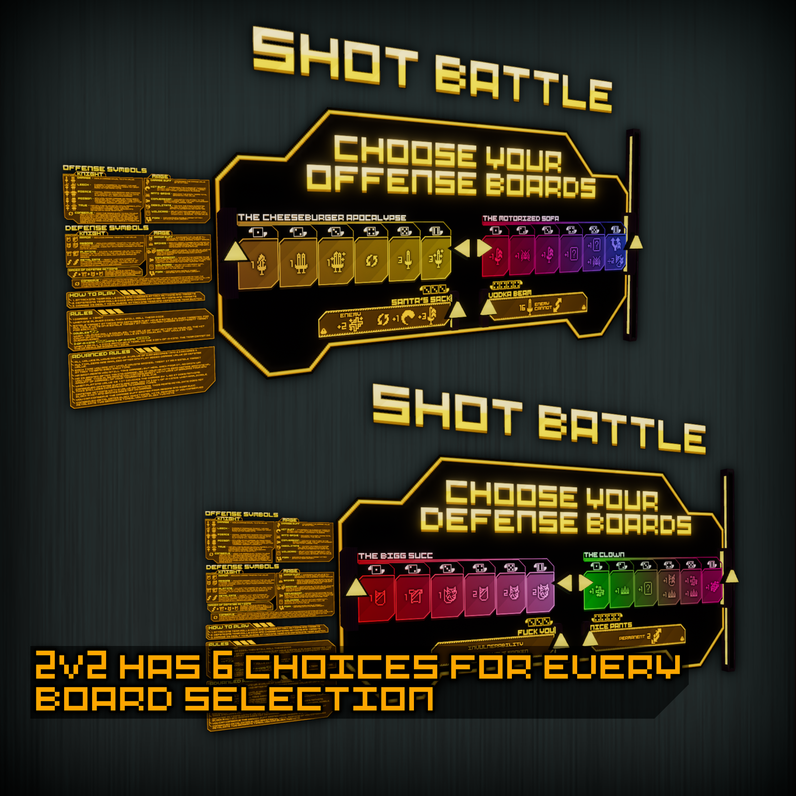 A 2 player roguelike game. This game has 8 levels with 2 possible bosses per level. Players will upgrade 1 of 2 randomly selected spaces before each fight. Each level the boss gets more HP and more powerful boards. The exact win rate when playing with 20HP is somewhere at less than 5%. This game is the most complicated and is recommended for players already comfortable with Shot Battle.