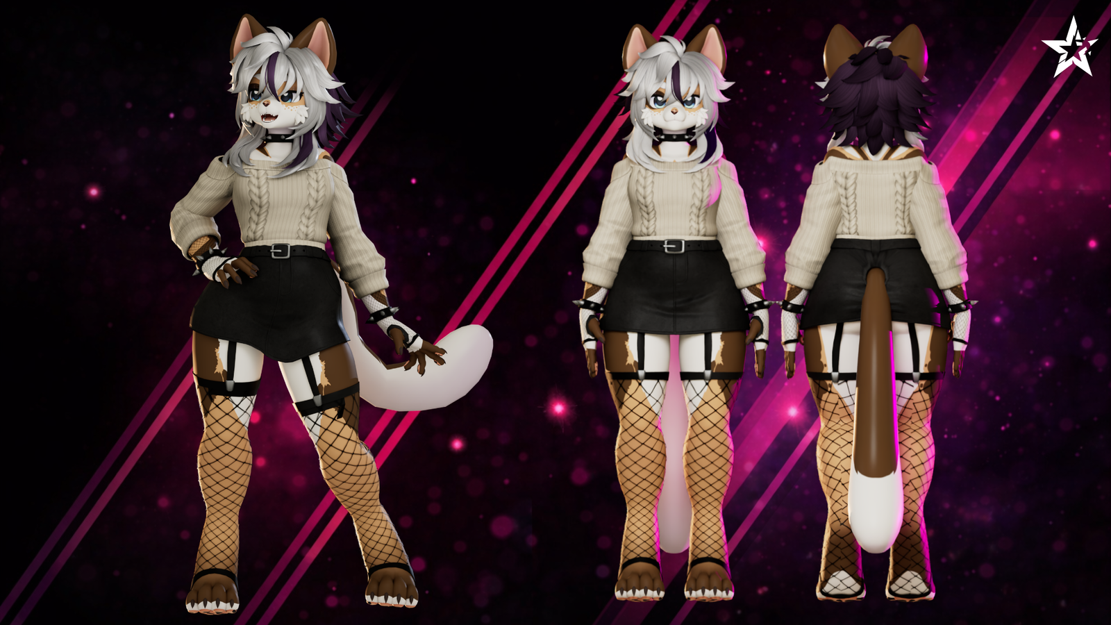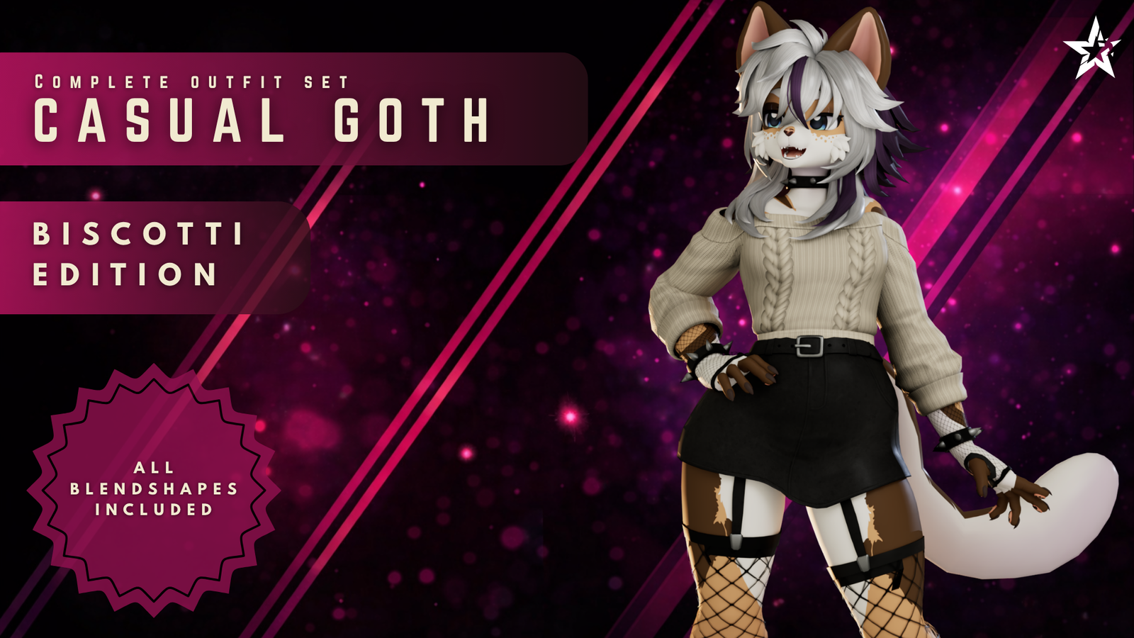 Bring the perfect balance of cozy and edgy to your Biscotti avatar! The Casual Goth outfit set features a highly detailed, off-the-shoulder cable-knit sweater paired with a sleek belted skirt and striking fishnets. Whether you're hanging out in cozy worlds or hitting the club, this outfit adapts to your vibe.