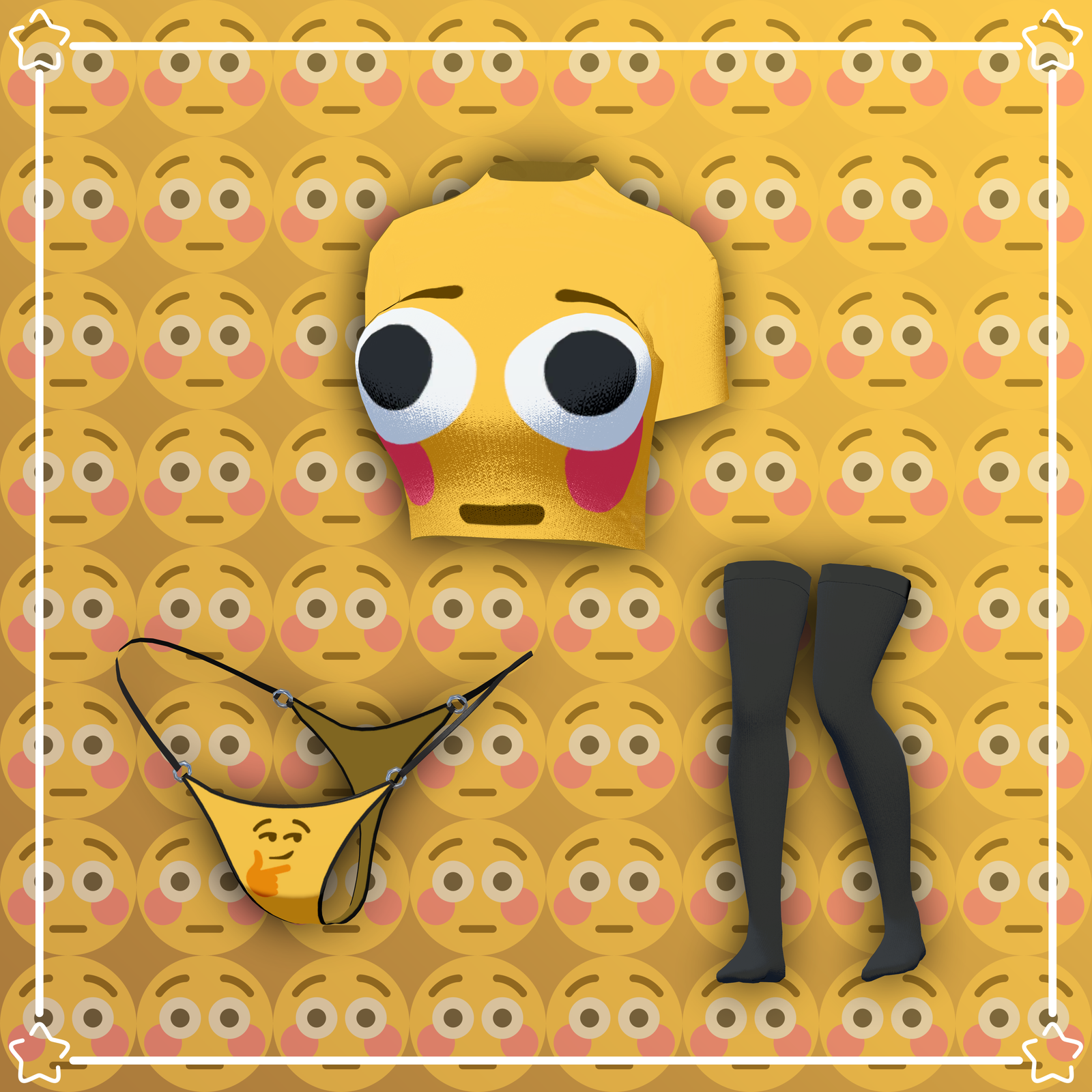 3 piece outfit, this product contains a complete outfit composed of a yellow flush emoji t-shirt, a smirk emoji underwear and a pair of generic thigh highs.