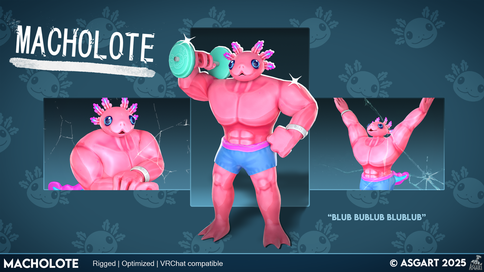 Dive into VRChat with Macholote, the ultimate Axolotl whoβs as jacked as he is adorable. With his colors, powerful stance, and unapologetically confident attitude, Macholote is the perfect avatar for anyone looking to flex both muscle and personality in the metaverse.