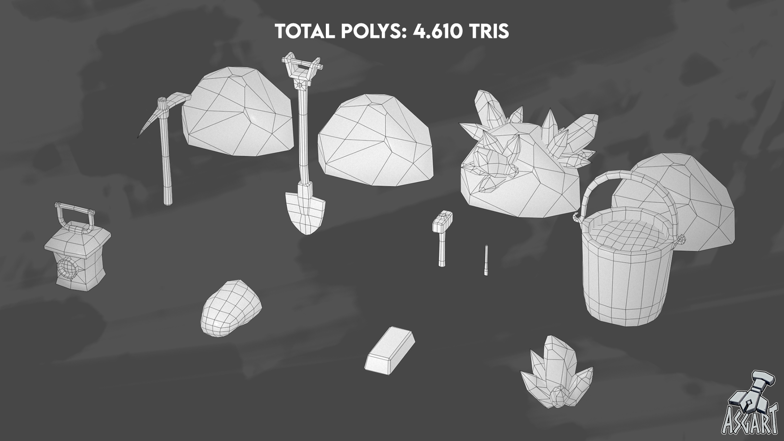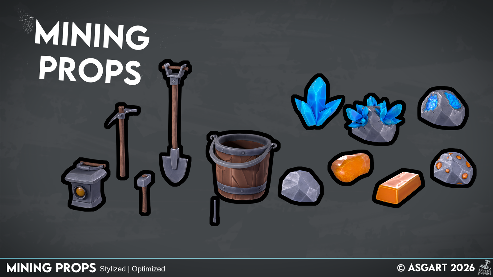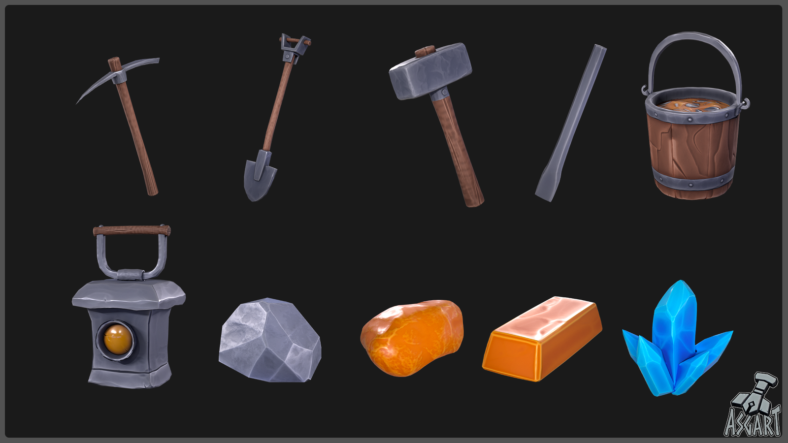 This pack features a carefully crafted collection of stylized mining-themed 3D models, including: