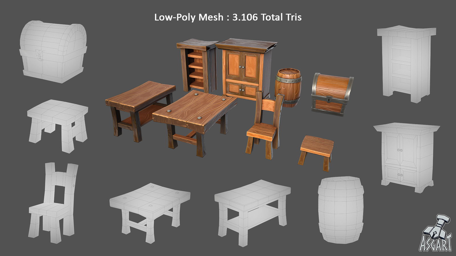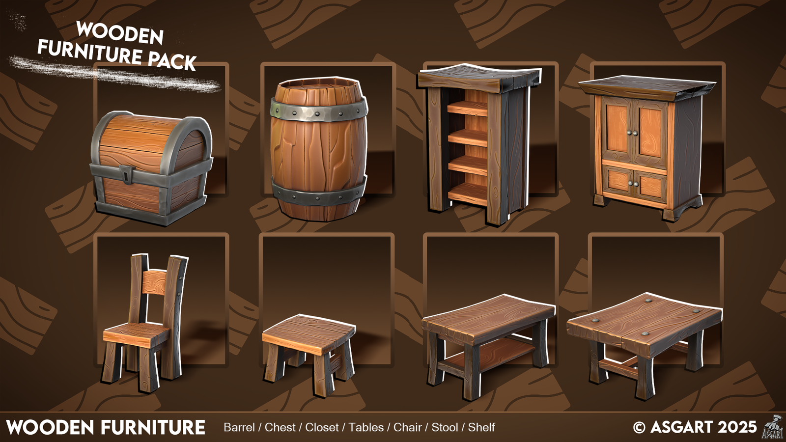 • 8 unique assets: Barrel, Chest, Closet, Chair, Stool, 2 Tables, and a Shelf