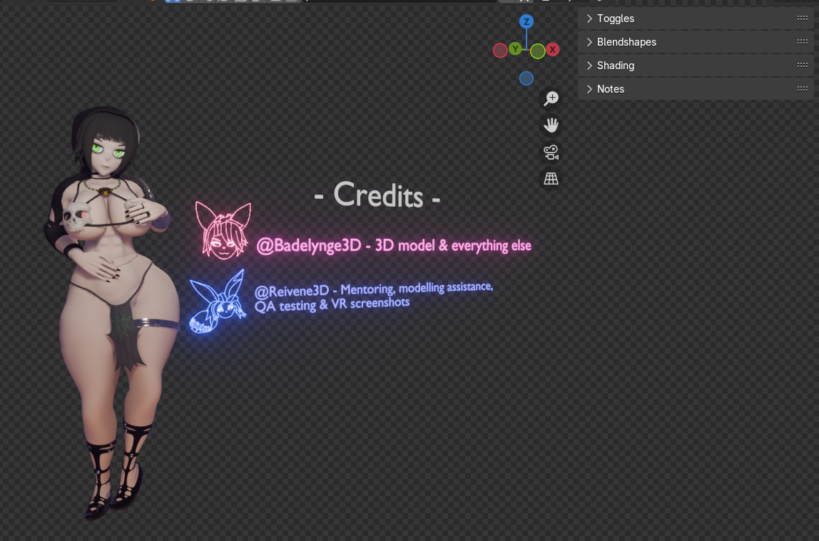- Custom optional "BadeTech" python script that allows for easy clothing/collection toggles, a robust custom blendshape menu with a search feature, as well as toggles for alternate skin textures!