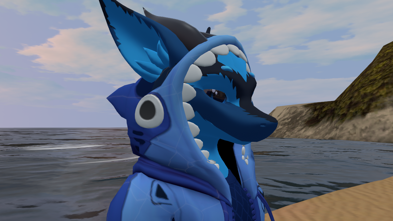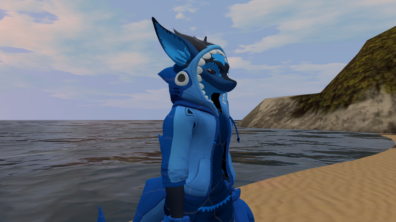 Silly shark hoodie complete with dorsal fin and derpy attitude.