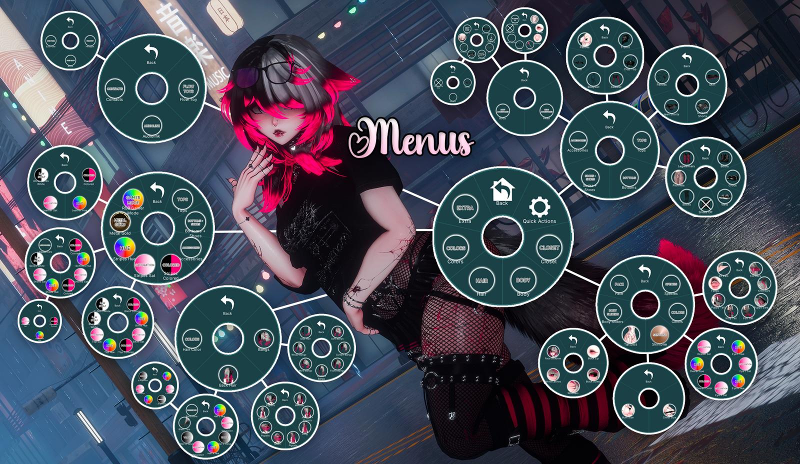 Bodysuit, Lollipop, Wire Glasses, Necklace, Harness, Boots, Slidess, Socks, Fishnets, Legwarmers, Body and Makeup options, Hair Swaps, Cat Ears and Tail, Puppy Ears and Tail, Elf Ears, Fangs, Color Swaps/Radials, Flow Toys