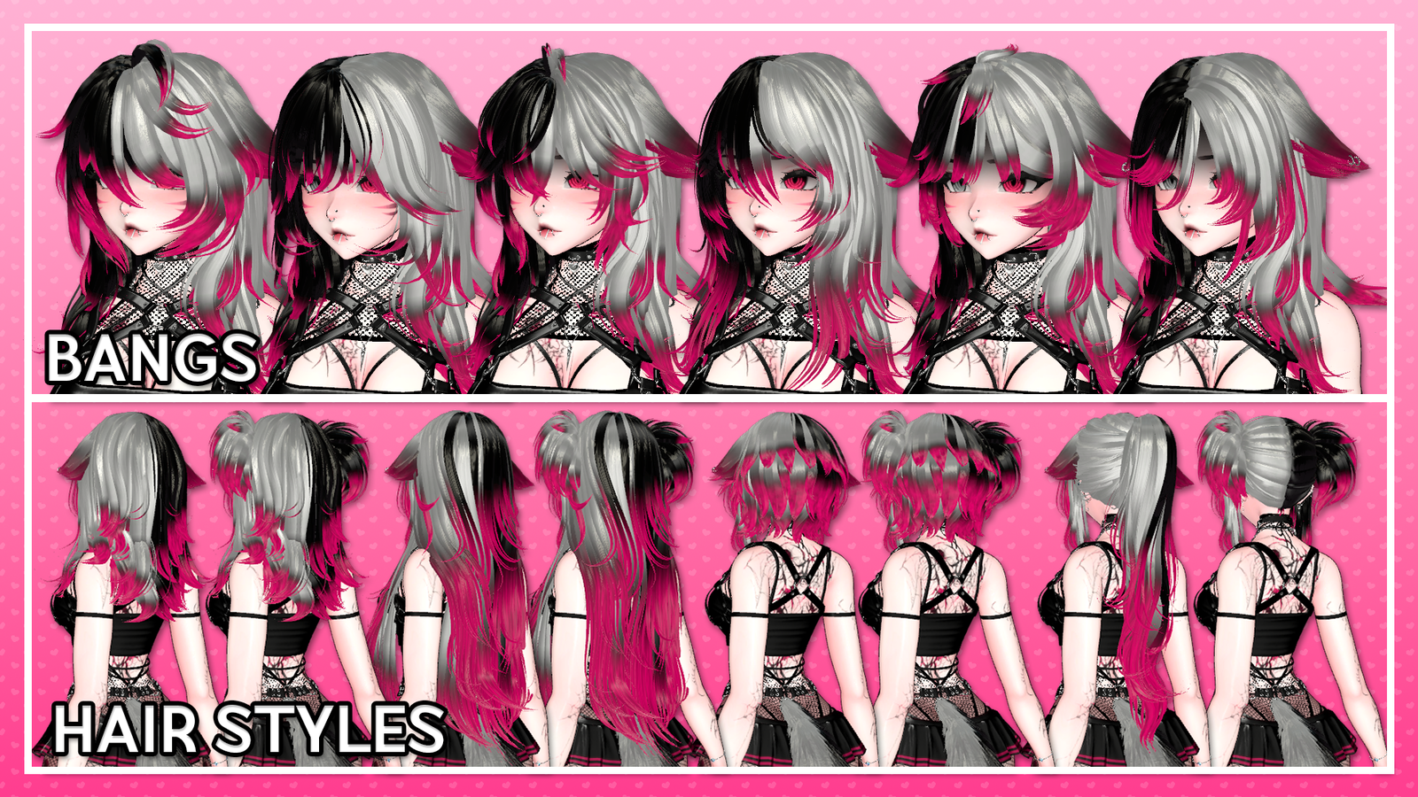 ➳Because Physbones toggle on and off between hair swaps for better performance, there is a small chance they will get stuck on the face when switching bangs. If this happens, swapping in and out of the avatar or rejoining the world will fix it.