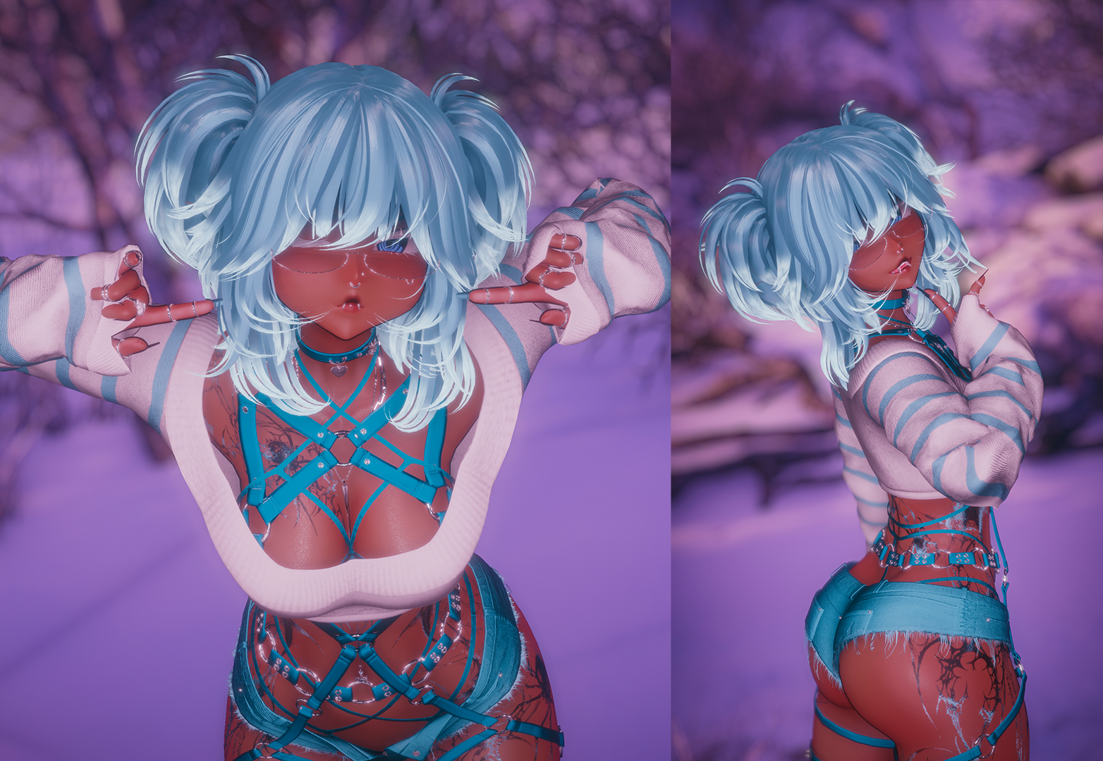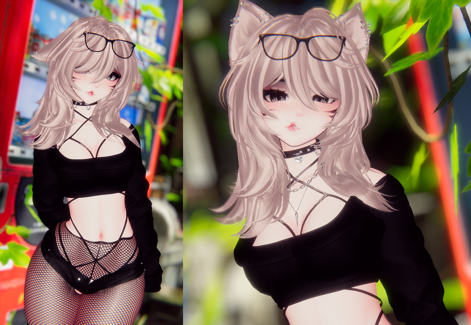 Body, Dolphin Shorts | Head | Eyelashes, Matcaps | Body Tex, Head Tex 1 | Head Tex 2 | Tattoos | Eyes | Palms Mask | Body Matcap | Piercings | Earrings, Jean Shorts | Lollipop | Fox Ears and Tail, Puppy Ears and Tail | Cat Ears and Tail, Sweater | Boots, Belly Ring | Rings 1 | Rings 2 | Chunky Glasses, Particles 1 | Wire Glasses | Ponytail, Medium Hair, Curtain Bangs, T-Shirt | Wispy Bangs, Layered Bangs, Side Hair, Long Hair, Hair Textures, Scalp | Mew Bangs, Short Hair, Soft Bangs, Pigtails, Fluffy Bangs | Collar | Bodysuit, Belt, Skirt, Arm Straps | Pasties | Socks | Sneakers | Slides | Bracelets | Crop Top, Necklace | Harness, Bikini | Legwarmers, Garters | Flow Toys | Particles 2