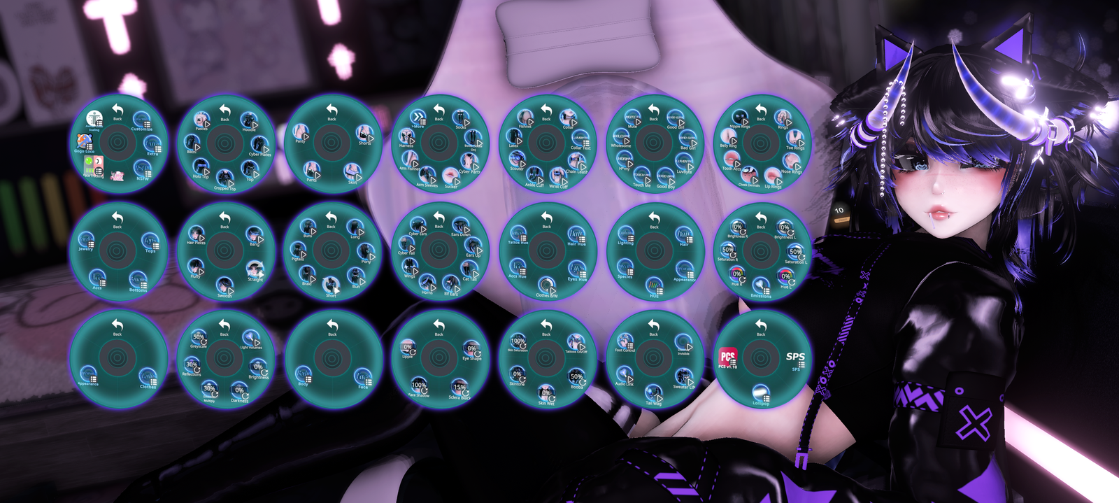 *was a lot of menu's so I didn't include all the hue shifts menus but you can customize the hues of hair left and right, hair emissions, eye left and right, accessories/accent colors, hologram, metals, and tattoos.