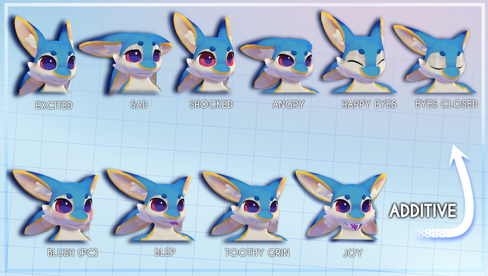 - Premade expressions with additive blep, grin and blush (PC only) toggle!