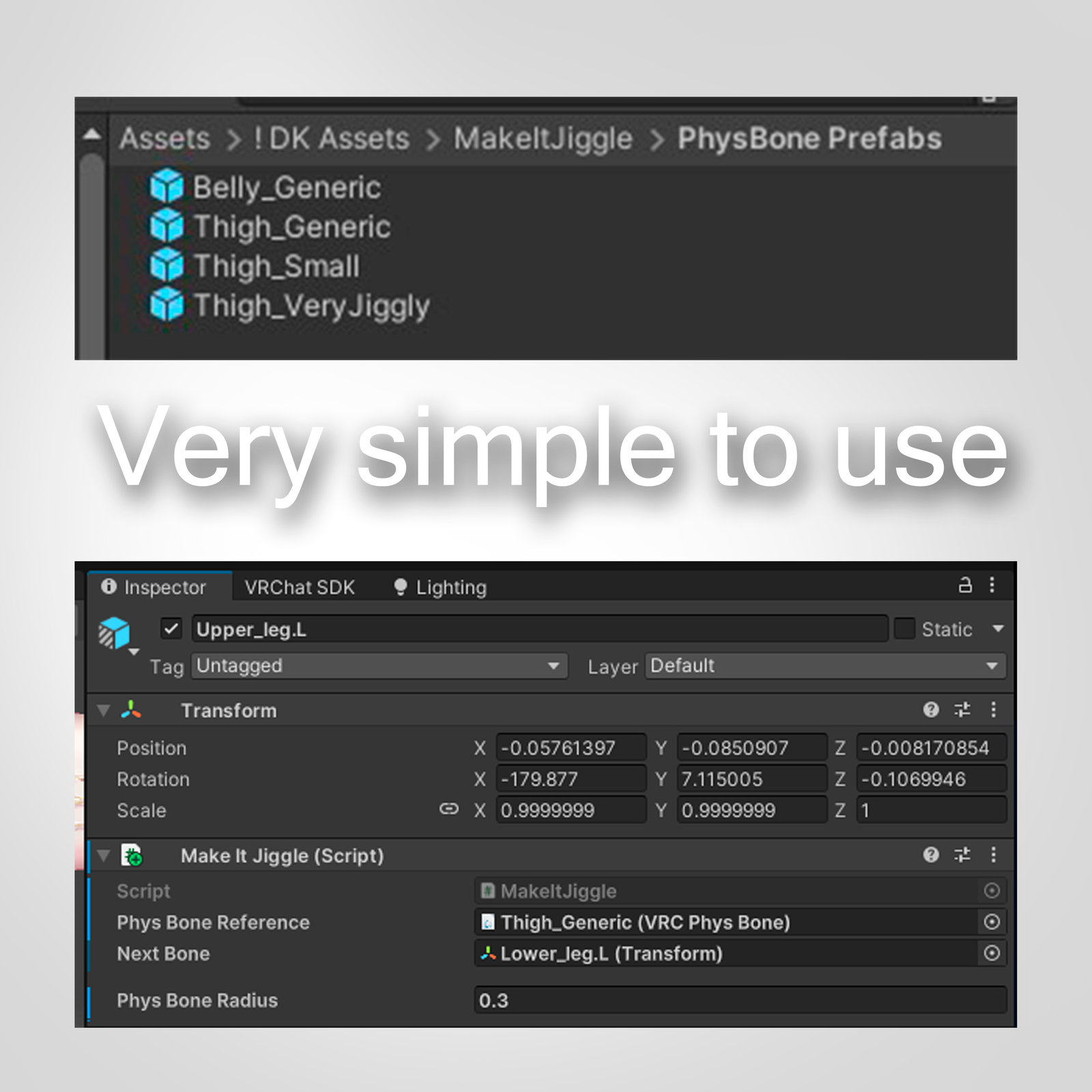 MakeItJiggle is a lightweight Unity component that easily adds jiggle physics to VRChat avatars.