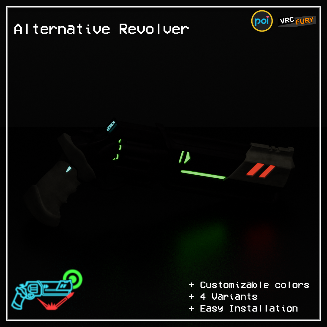 VRChat adaptation of the "Alternative Revolver", featuring its 3 original variants plus 1 new custom variant. Customize your revolver with custom colors, toss coins with the Marksman, charge powerful shots with the Piercer, bounce shots with the Sharpshooter, or go wild with the base variant.
