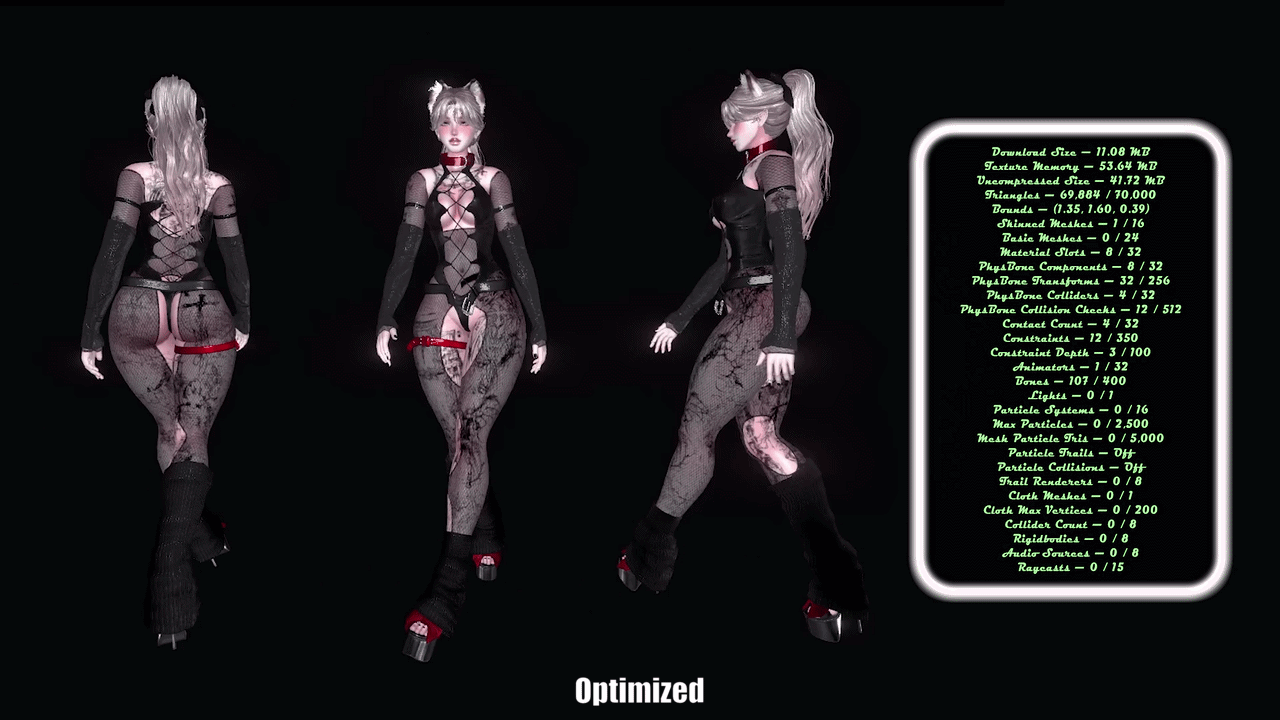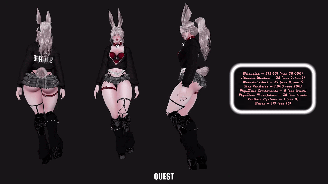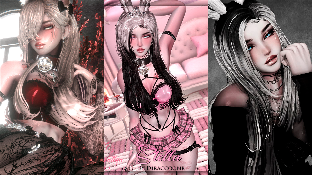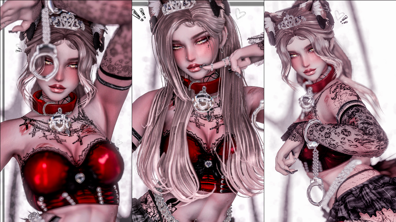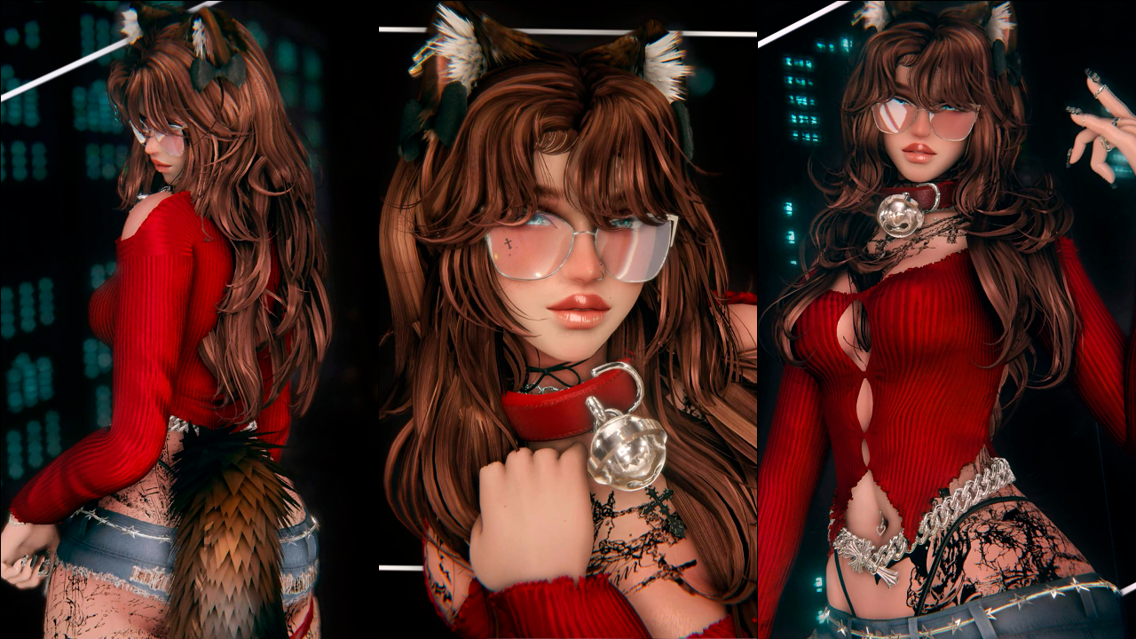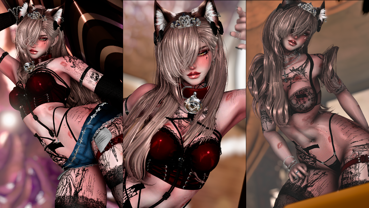 BODY (zinpia) - HAIR TEX, HEAD (sivka.) - ICON (awmi#6003) - ICON 2 (Maddiiee) - AV3 CREATOR (Rafa#0069) - HAIR TEX (Cicieaaa#7777) - SPS CONFIGURATOR (Wholesome) - HEART (KisuPixelTopia) - LIMP SYSTEM (nanochip) - NAILS (yaoomi) - BODY TEXTURE (Jvliette) - BABYHAIRS, HAIR TYPES, BRA, KITTY SET, COLLAR, CORSET, STOCKING (nessy) - BELT, BIKINI, HEELS, WARMERS, STRAPS ARM, TIARA, NAIL, CHAIN BELT, HANDCUFF, GLASSES, MUZZLE (milkymutt) - BODYSUIT, JACKET, SHORTS (Weeeby) - BODYSUIT LACE, ROPE (therealthiccwitch) - BUNNY SET (winksvr) - CUTE TOP, SLEEVE (ALTAIRboutique) - GARTER, HEELS, NAILS (aikavr) - CHOKER BOW (khihani) - JEANS, LONGSLEEVE, SHIRT, RINGS, BRACELET, BOOTS (saikura) - PANTIES, SKIRT, BODY PIERCING (Vinuzhka) - PASTIES (Naudine) - WARMERS ARM (LokisVanity) - FACE PIERCING, EARRINGS, NECKLACE, ANKLET (Ssukiii) - TATTOO 1 (uwublossem) - TATTOO 2 (MichisMadHouse) - BOWS (luccy) - NECKLACE CHAIN (puritydearte) - POLE (Dahiras)