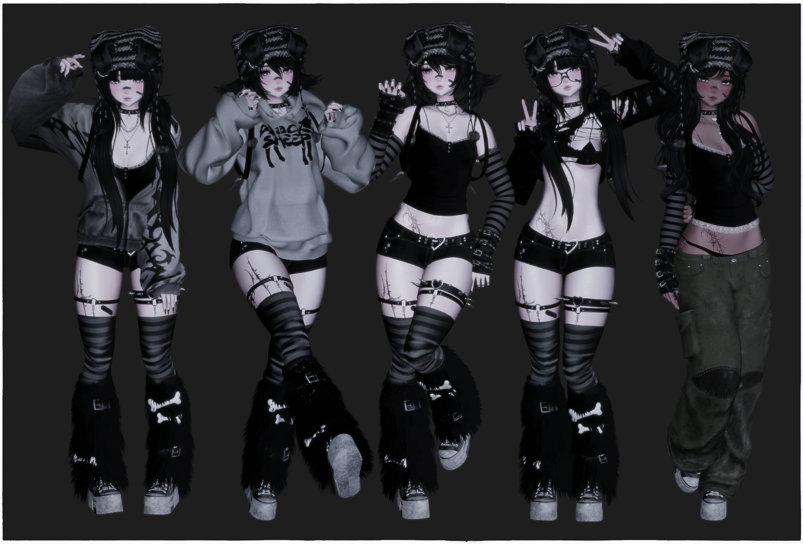 clothes: bandaids Foolystuffz, hoodie and ripped sweater Saikura, shorts and shirt set Tilly, jacket headphones Evan, cargo, sleeves, hand warmers Suki, leg warmers and biki Zoxl, thigh highs shizuki, hat no.129 yuri
