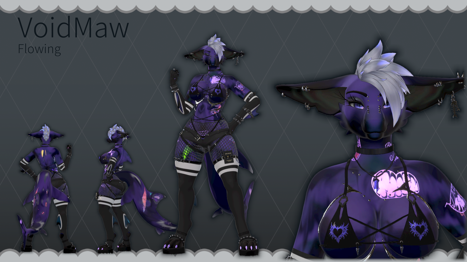 VoidMaw, a new texture from yours truly, for the amazing Calypso model made by foxipaws. She features color-shifting for her emissons a very fancy internal display on some of her fangs, and a lot of bite