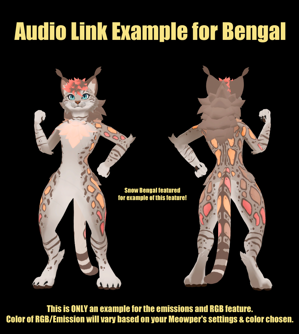 • Bengal Texture Packs• Eye Color (Optional use)• Matching Hair Color (Optional Use)• Emissions both b&w and RGB (Spot Glow - Optional Use)
