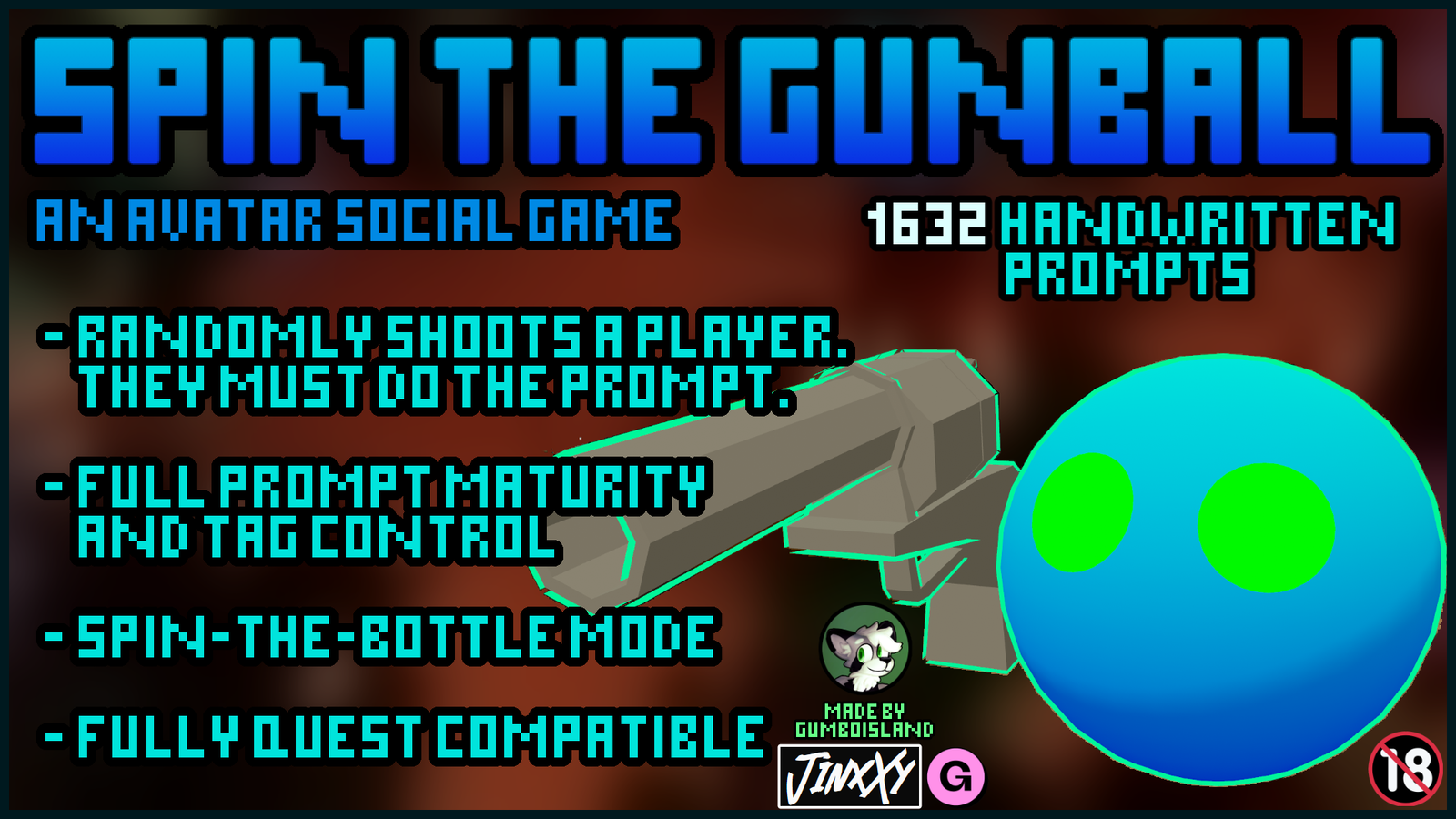 Grab and pull the ball, it will randomly shoot a nearby player! Slap the ball to roll a prompt for that player to do. Features 1632 hand-written prompts at varying maturity levels and tags so you can customize the game to the vibe of your group.