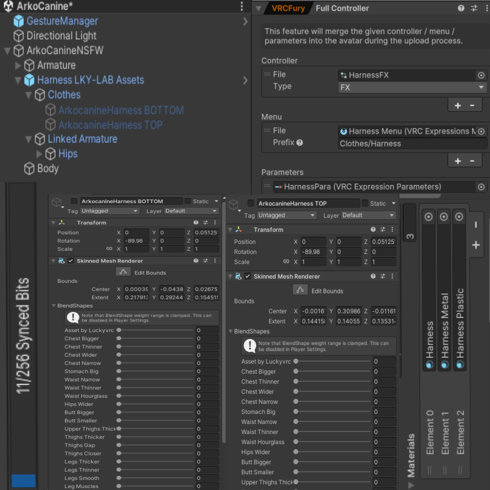 A simple 2 piece harness top and bottom toggleable all with optimized textures and materials, with easy to setup drag and drop and ready to upload with VRCFury, you will get a new submenu with 3 toggles and a hue wheel with icons!