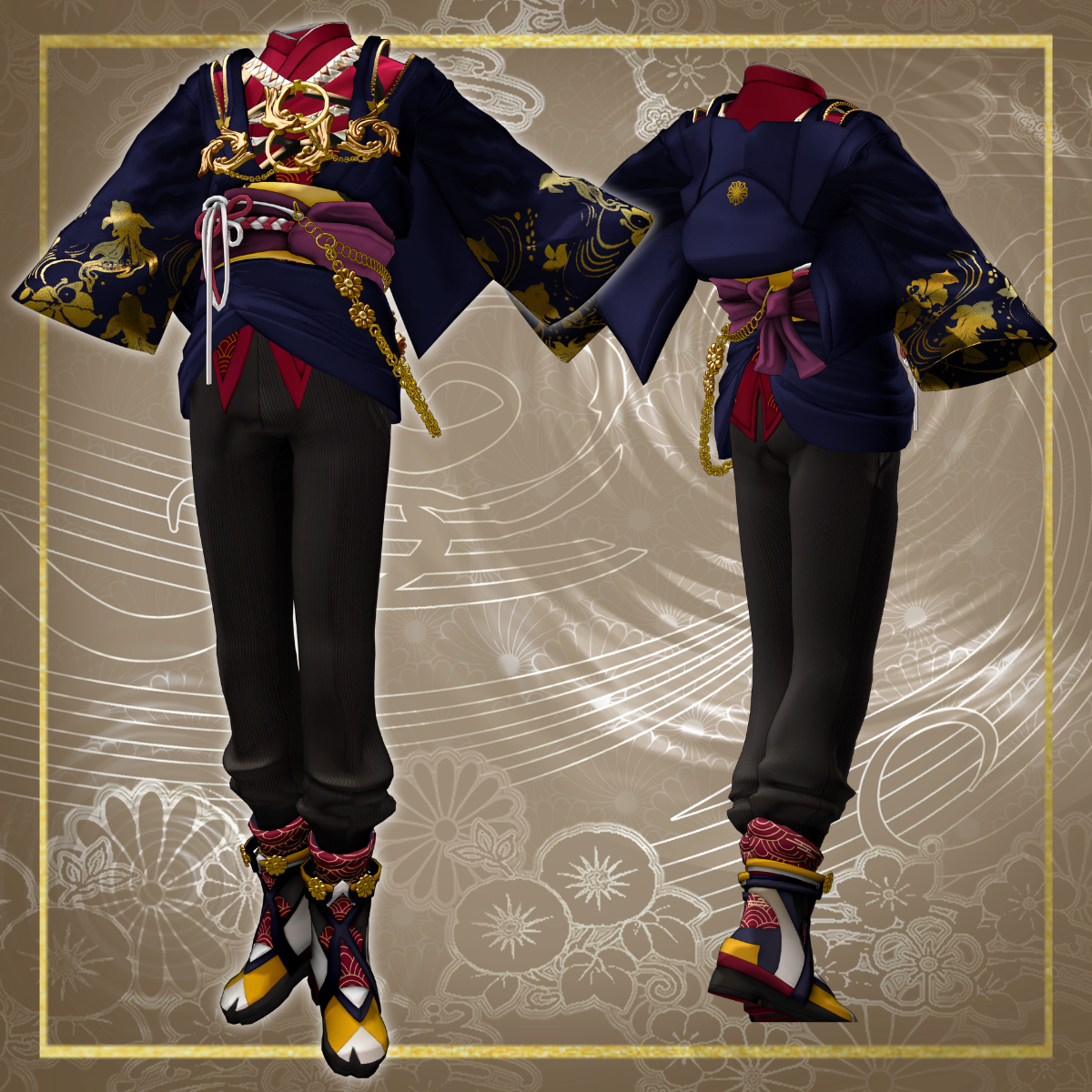 A gorgeous Japanese-style outfit for men, featuring goldfish-inspired accessories that gently sway at the chest. Suitable for everyday use.