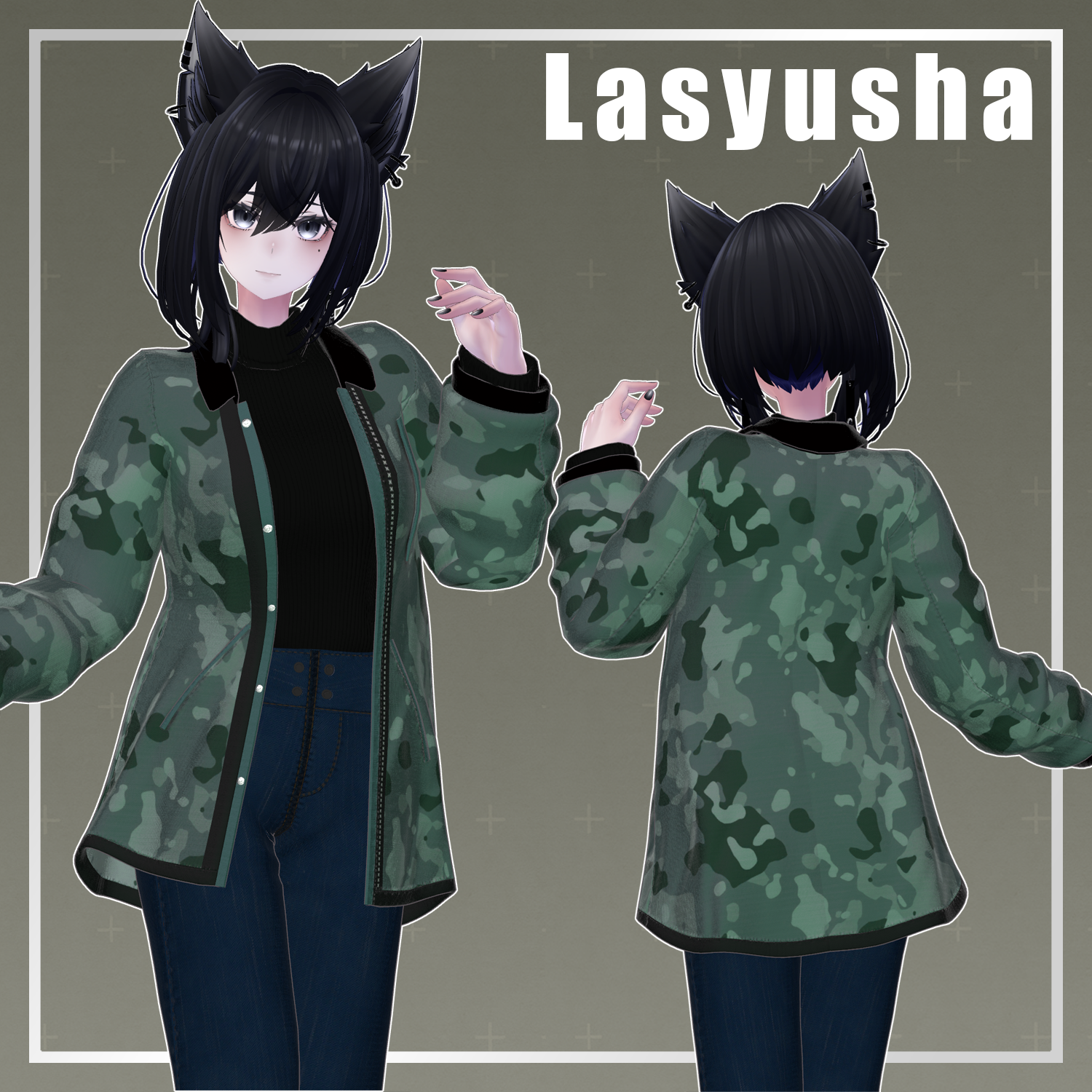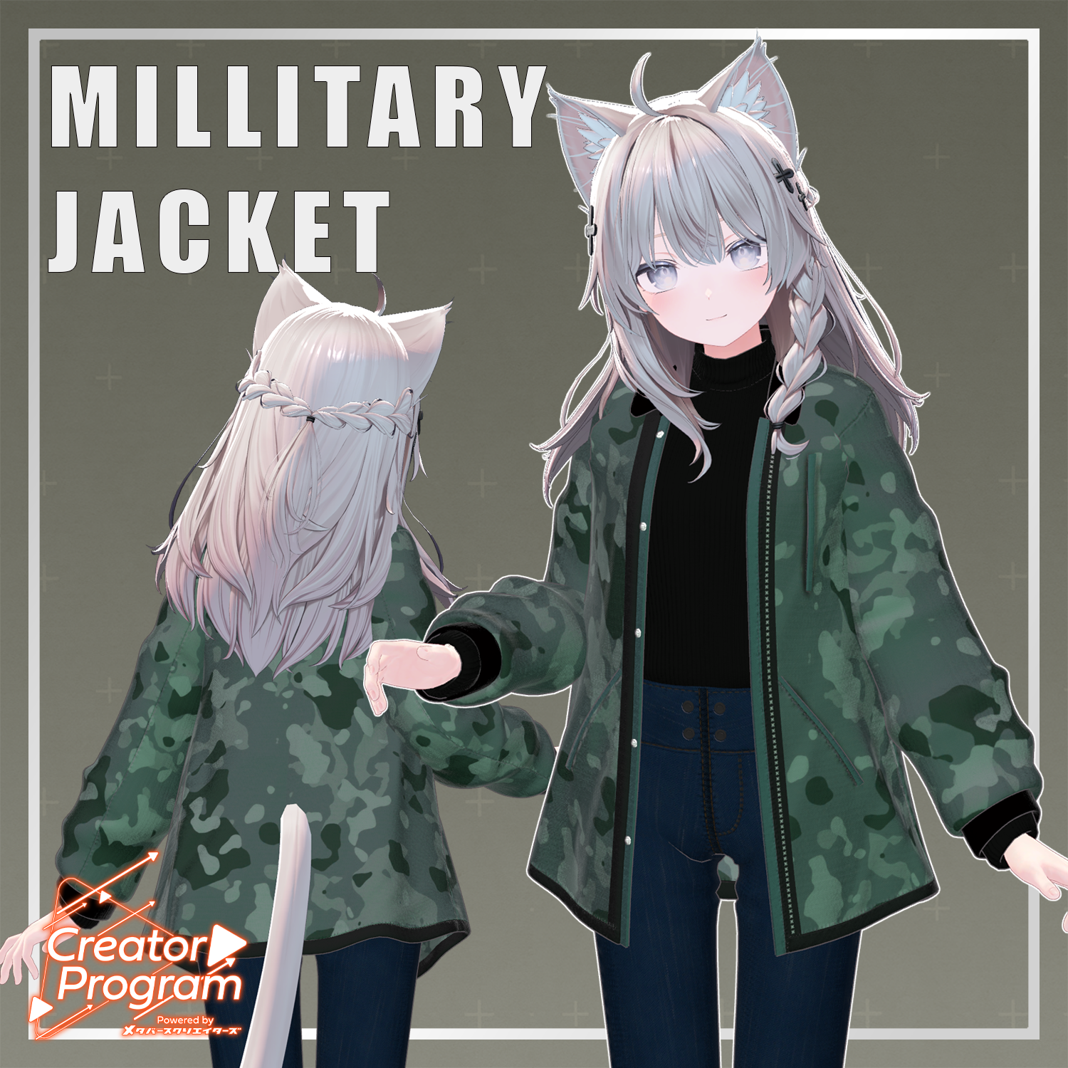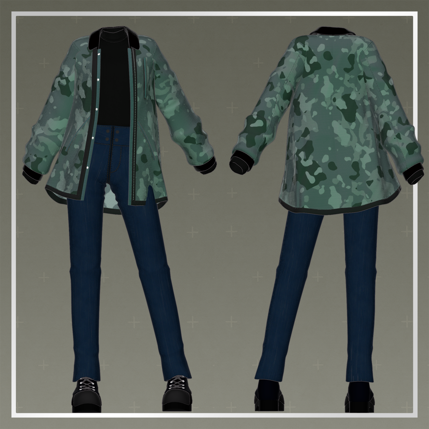 The jacket features a subdued camouflage pattern and a moderate length to create a gender-neutral silhouette. The inner black top and slim jeans were designed to blend in naturally, regardless of the atmosphere of the avatar they are paired with. Please try this out whenever you want to give your avatar a slightly different look than usual.