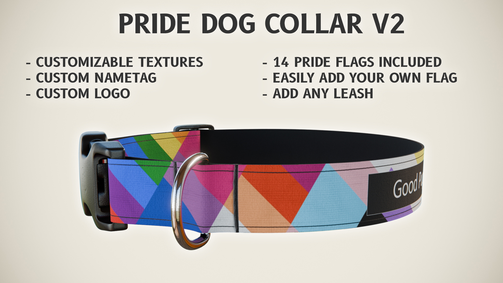 The Pride Dog Collar is a vibrant and expressive VRChat accessory designed to let your avatar wear their identity with pride. Featuring 14 unique pride flag textures and a customizable nametag, this collar is perfect if you want to shine with your colors.