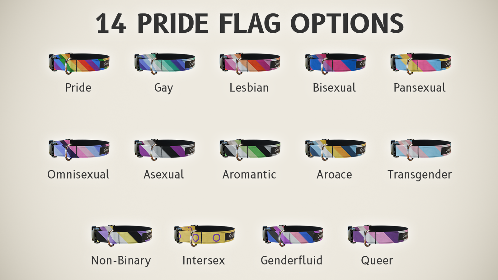 - 14 Pride flag designs: includes Pride, Gay, Lesbian, Bisexual, Pansexual, Omnisexual, Asexual, Aromantic, Aroace, Transgender, Non-Binary, Intersex, Genderfluid and Queer.