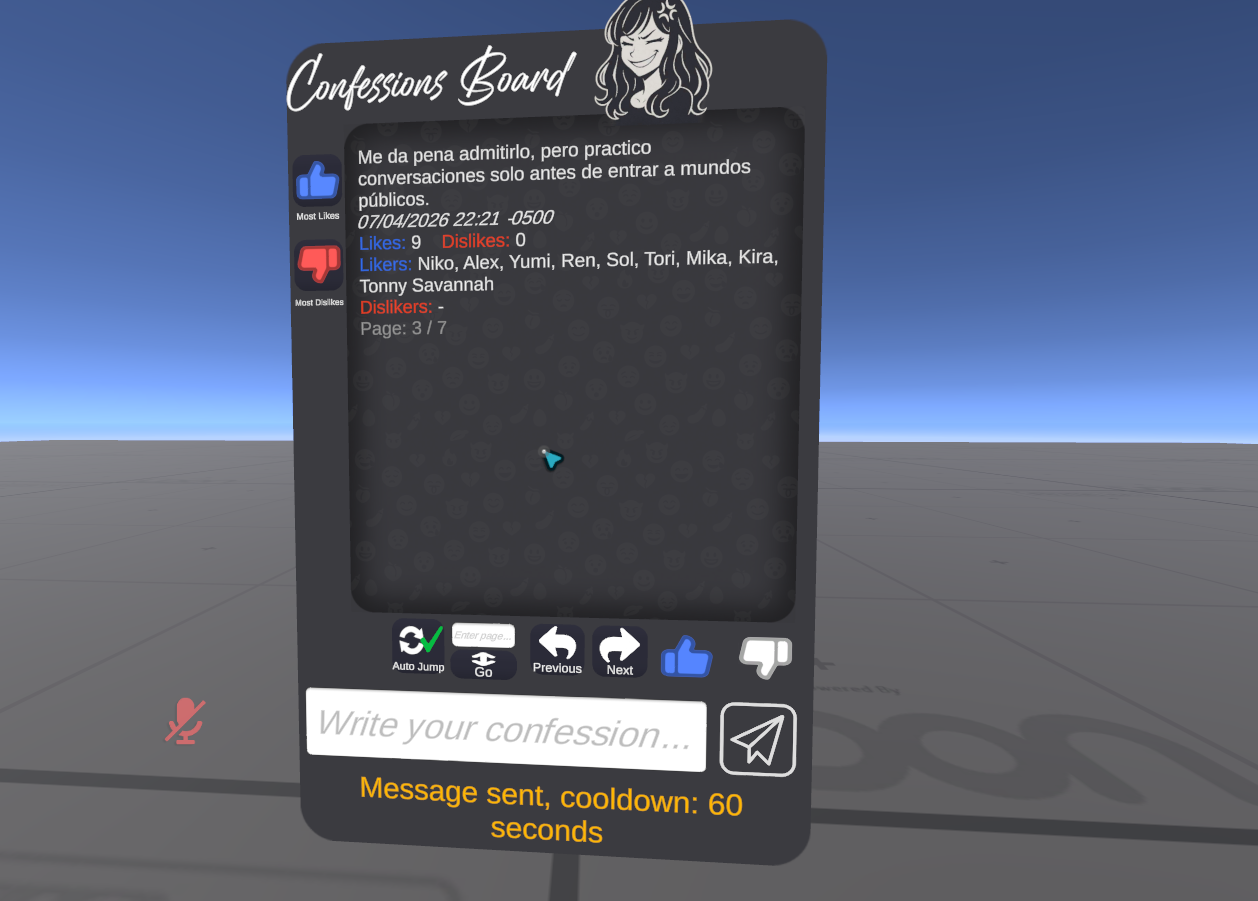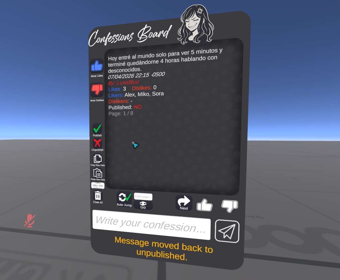 Confessions Board is a synchronized message panel system for VRChat where players can post anonymous-style confessions, thoughts, jokes, secrets, or small community messages for everyone in the instance to read. It transforms a simple wall, screen, or UI corner into a living social feature full of curiosity, emotion, humor, and replay value. ๐ญโจ