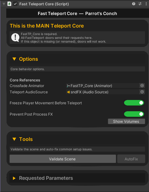 ✅ FastTP_Core prefab (Core controller: FX + audio + teleport execution)