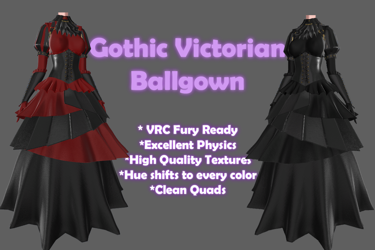 This beautiful dress is VRC Fury ready, drag and drop. Simply drag one of the prefabs onto your avatar and upload, that easy! This dress uses RGB masking through poiyomi, so you can hue shift any part of it into any color you want all from the material, and already comes with in-game toggles! Additionally, the dress comes with high quality textures in case you're not using poi. This ballgown has clean quads and excellent physics, and is also made to fit every zinfit blendshape!