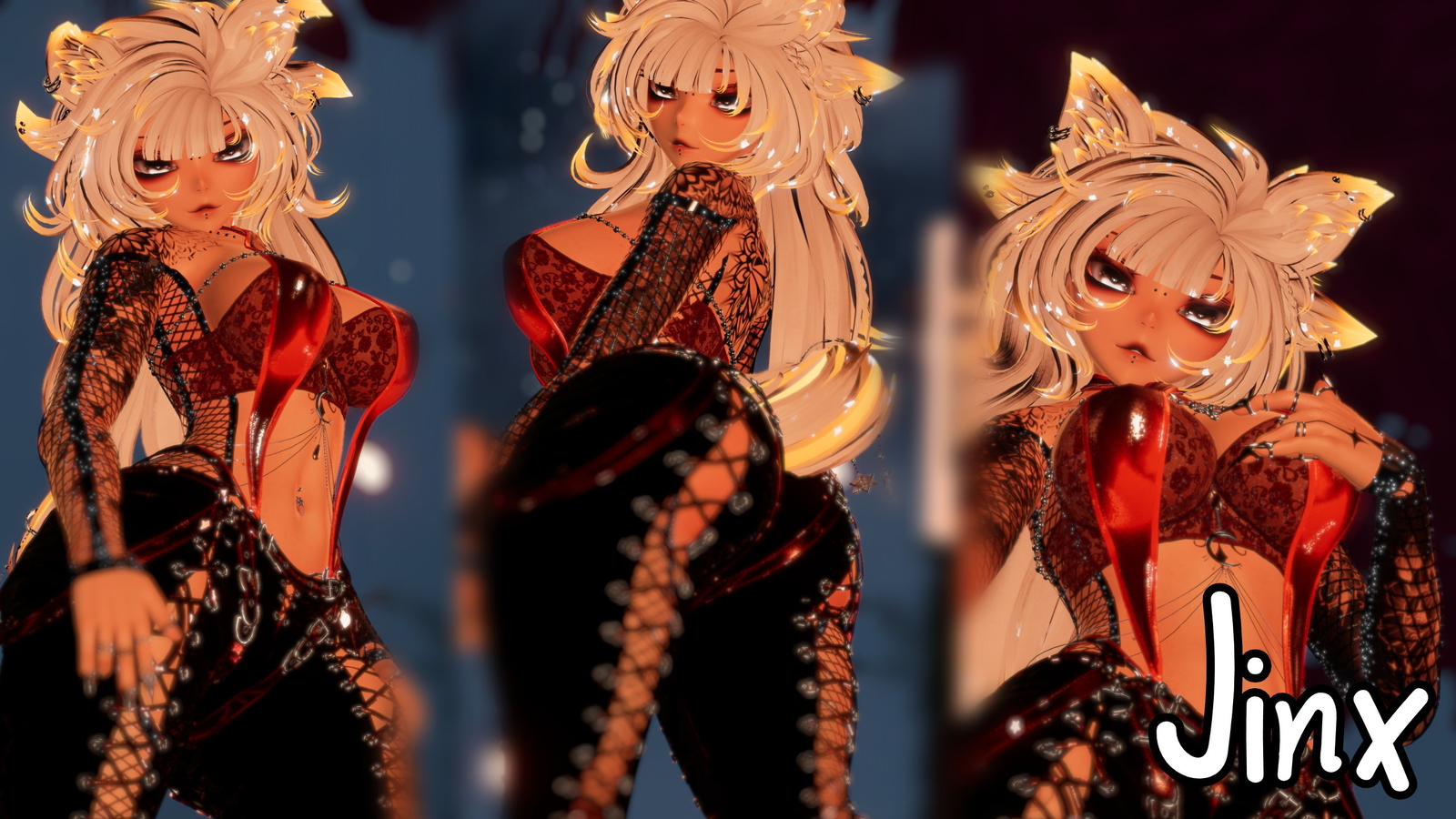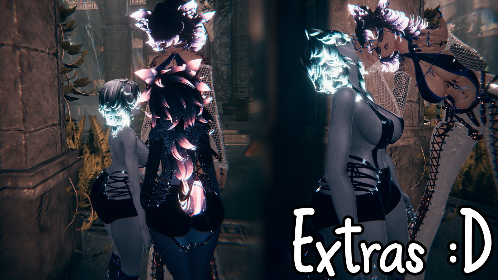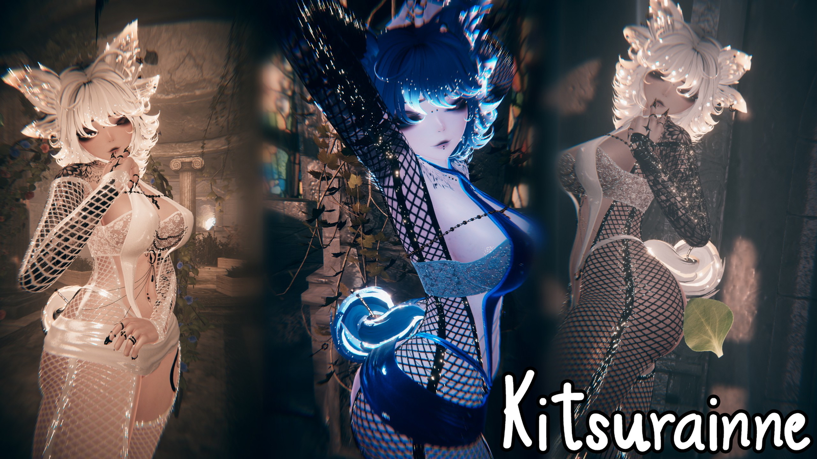 Base version - Bodysuit Top, Bodysuit panties, Chains, rings, Corset, Glasses, Ears, Pants, Shorts, Skirt, Pasties, Bodychain, 2 hair options, Tail, Fishnet suit, Fans