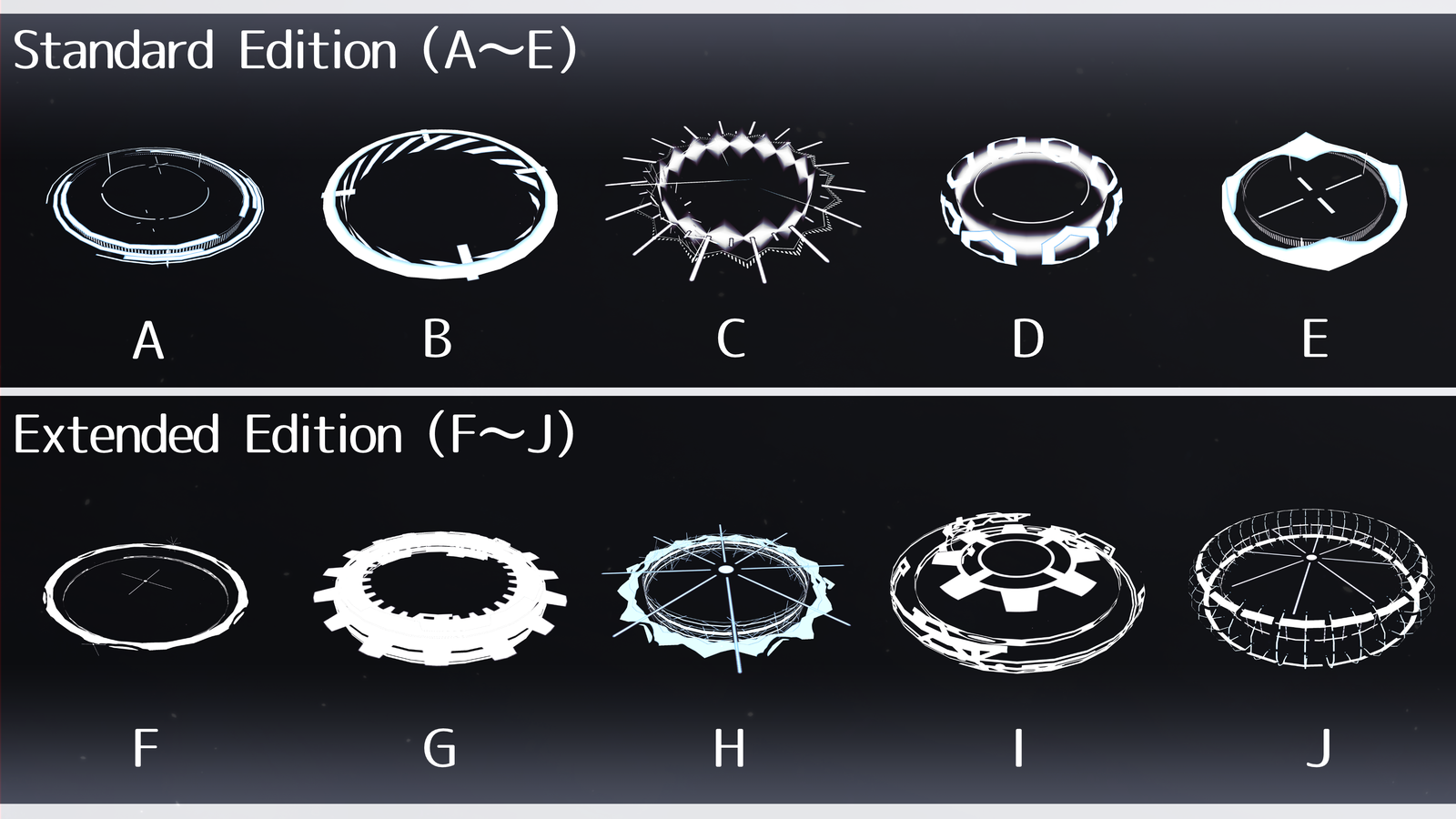 Colors and glow intensity can be adjusted via material settings, while rotation speed and movement can be customized through the animation settings to suit your preference. The Extended version adds five more styles: Types F, G, H, I, J.