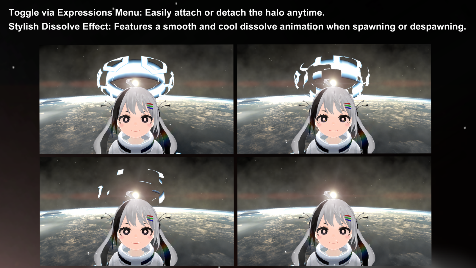 - The dissolve effect is controlled via animations. It will not function if you simply drop an individual halo prefab into your avatar.