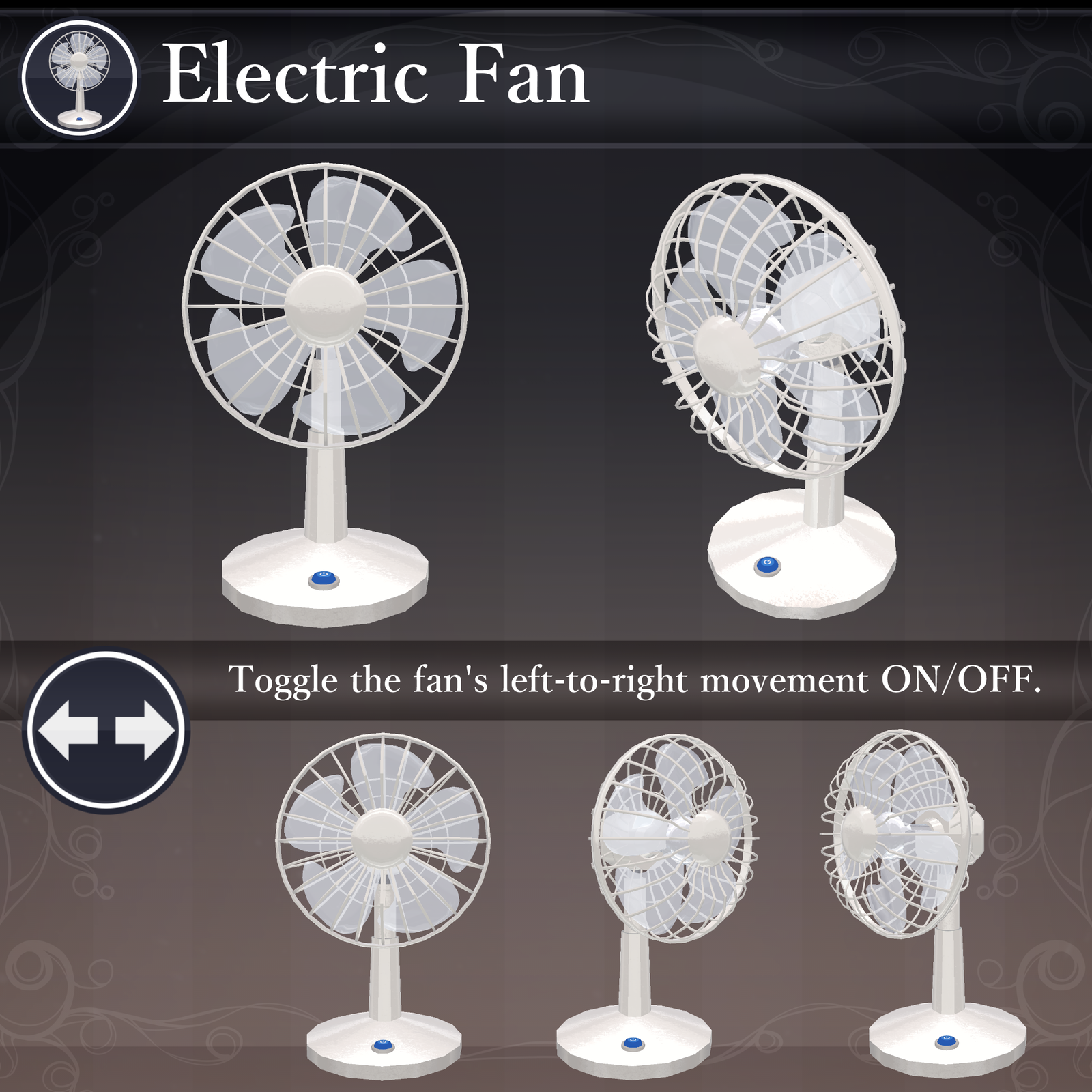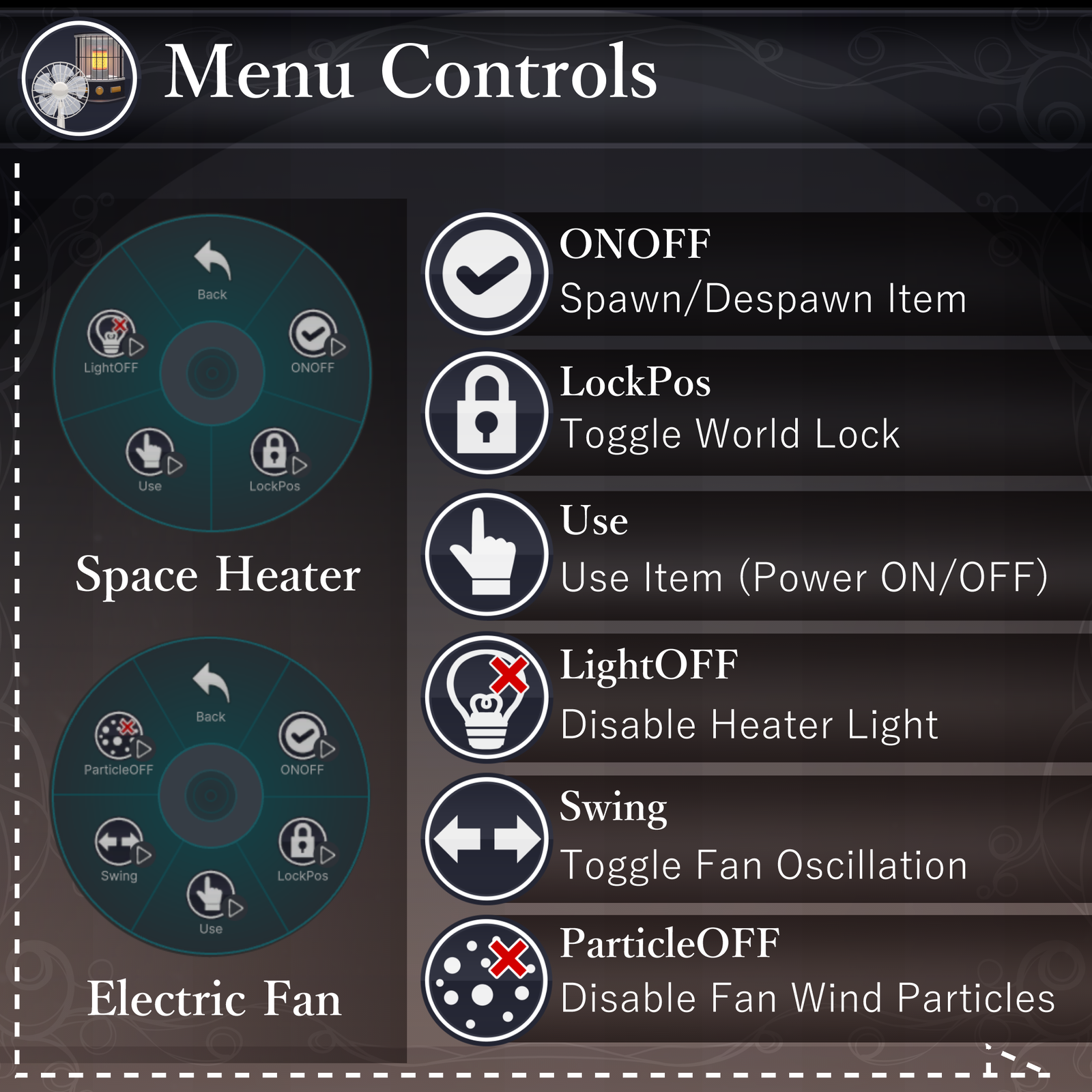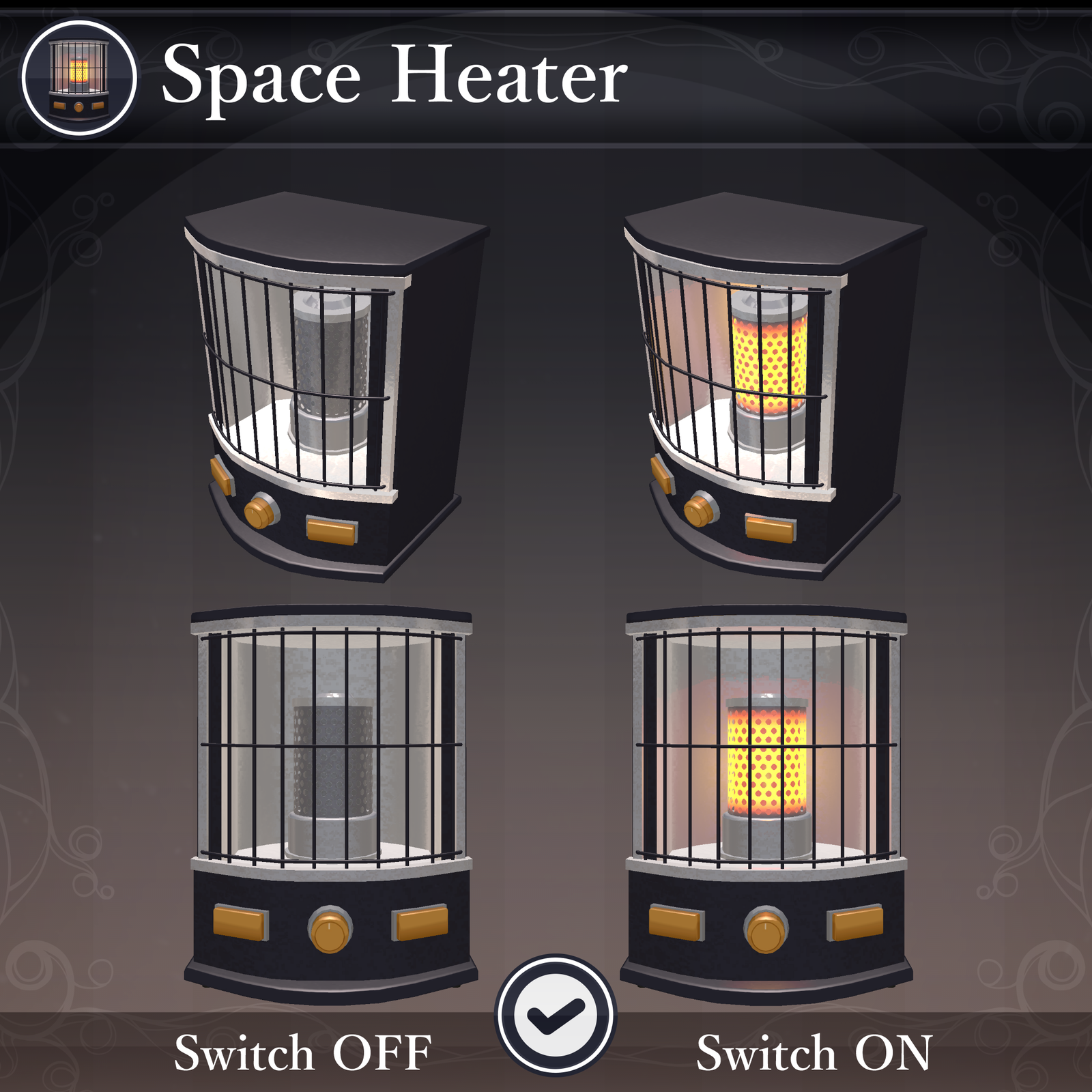 Controlled via the menu, you can toggle its appearance, lock its position, and flip the switch to start it up. Use it to create a cozy seasonal hangout or as a fun conversation starter with friends!