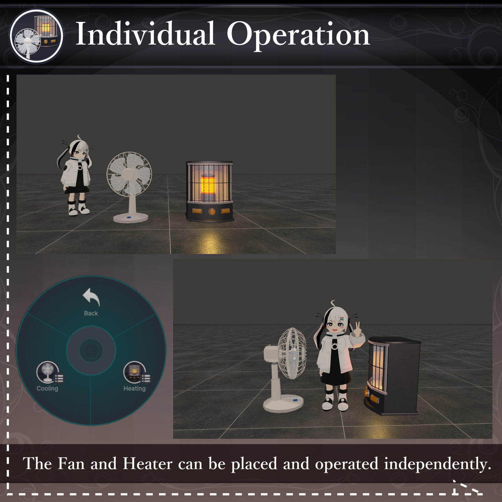 "Heating and Cooling" is a placeable fan and heater gimmick set designed for VRChat. It is compatible with Modular Avatar for a quick and easy setup.