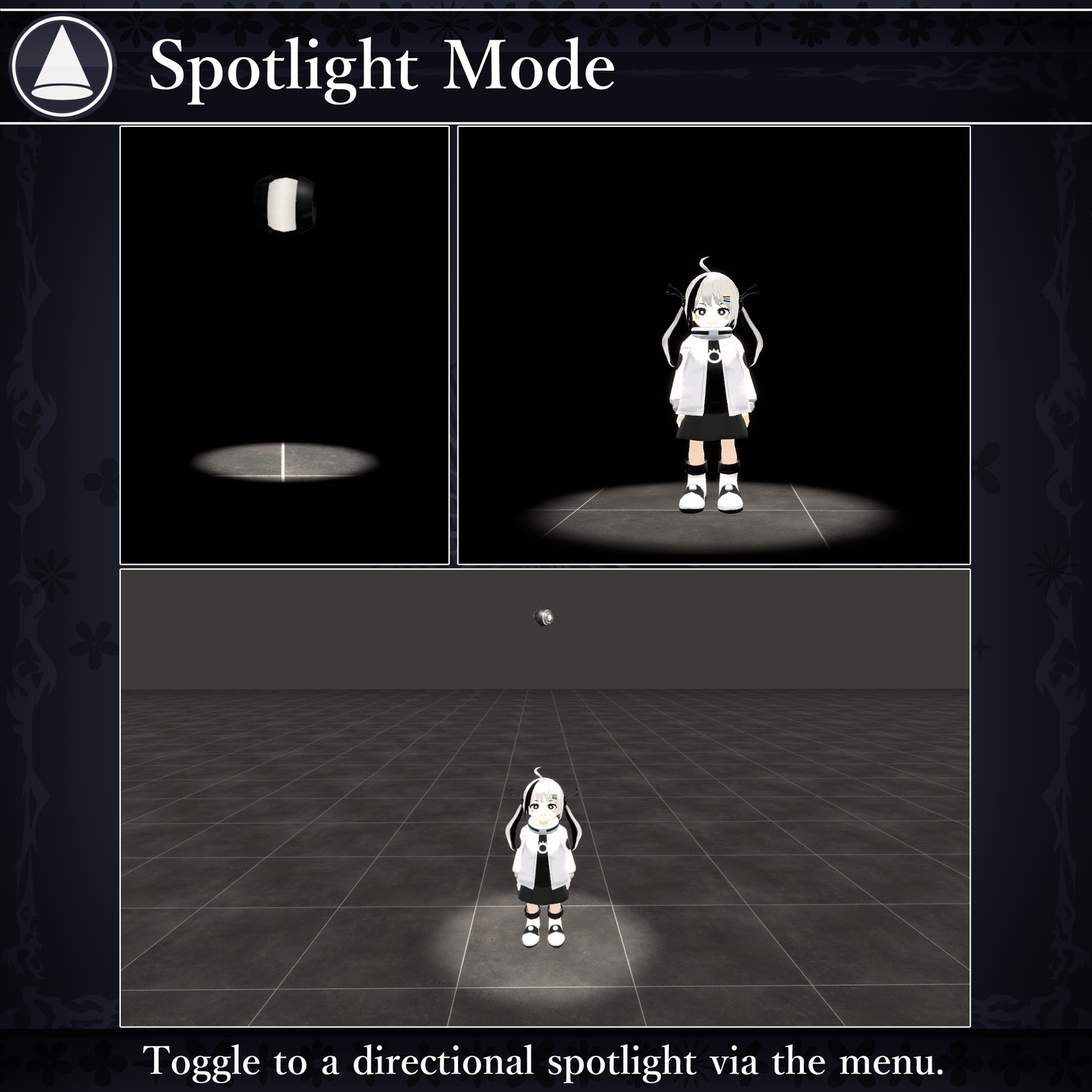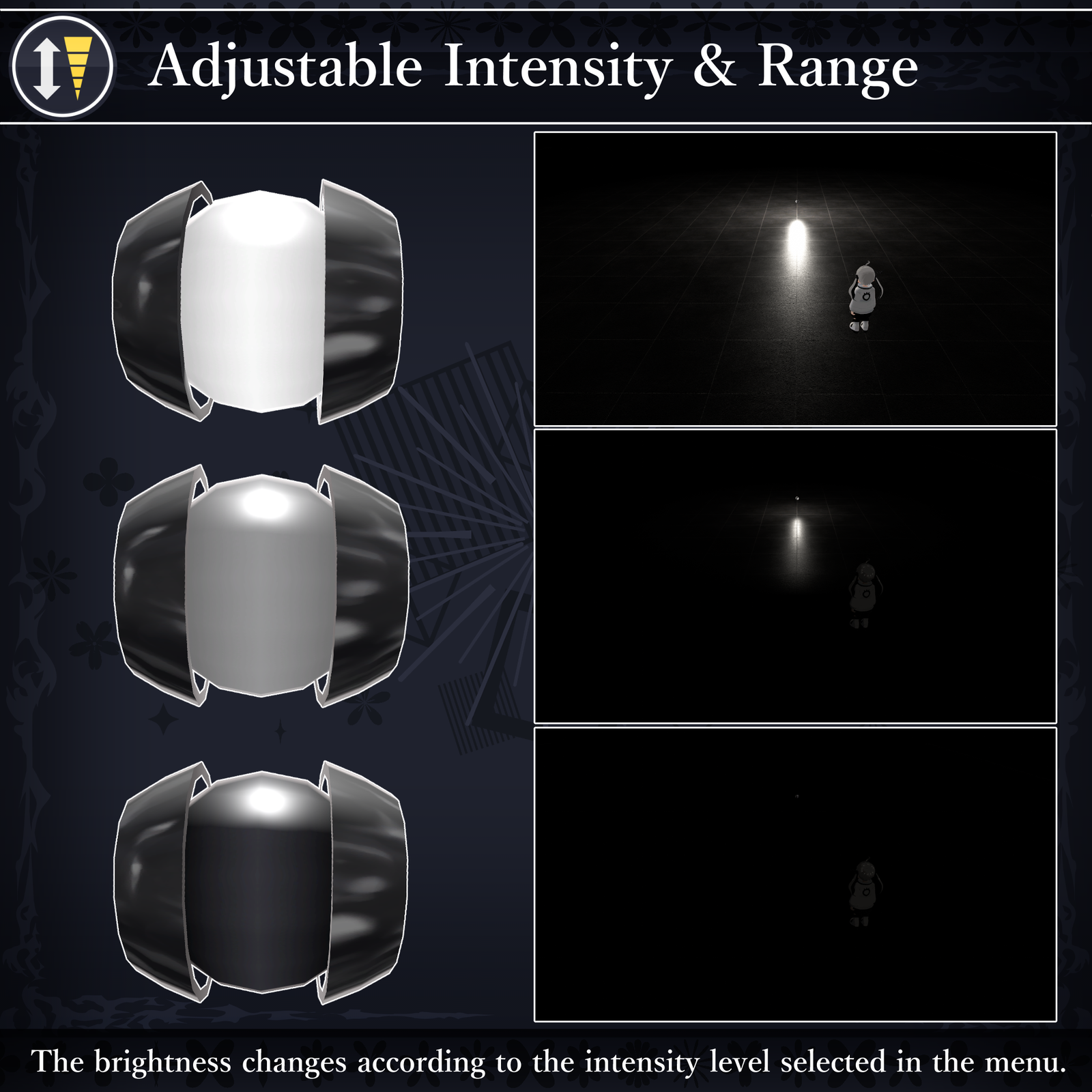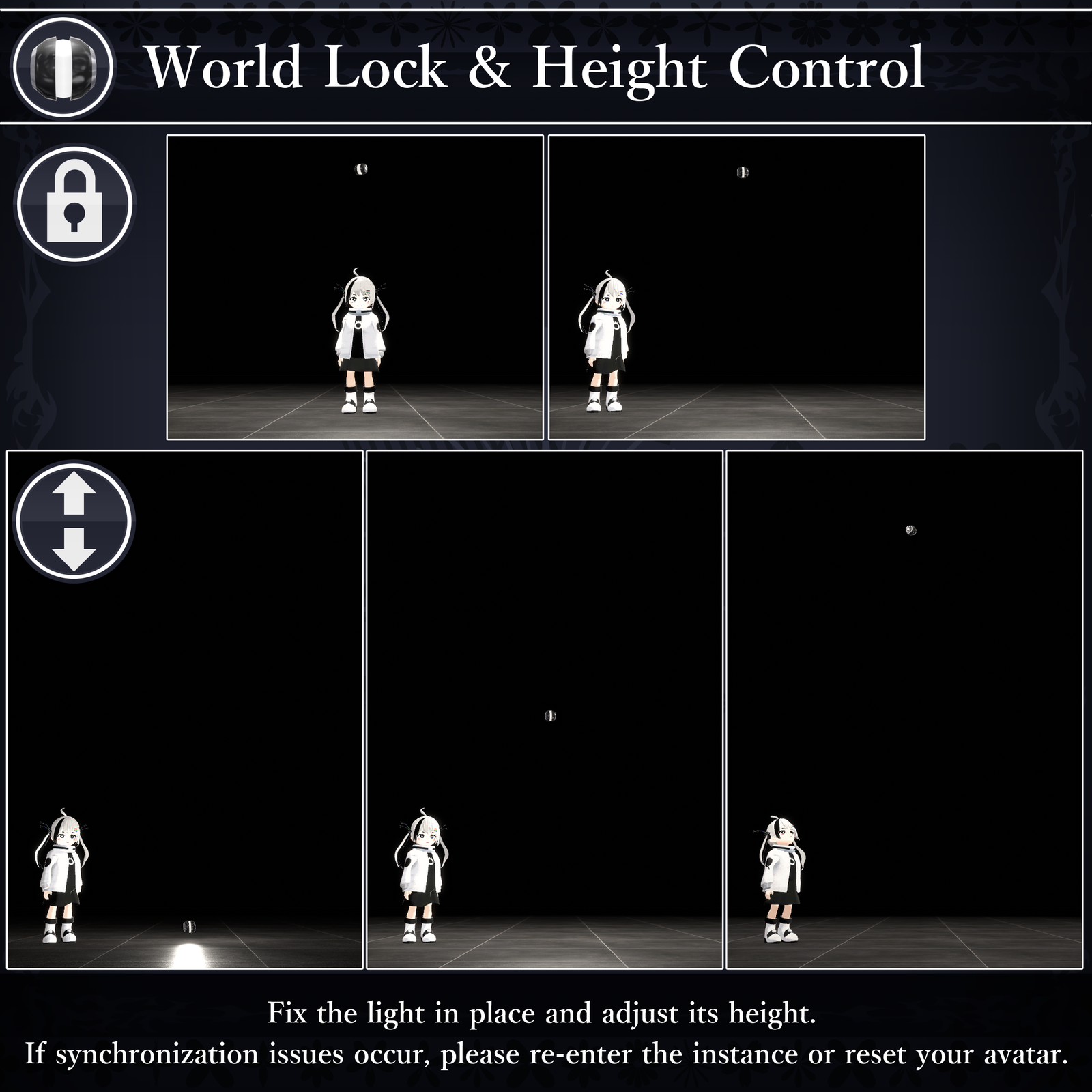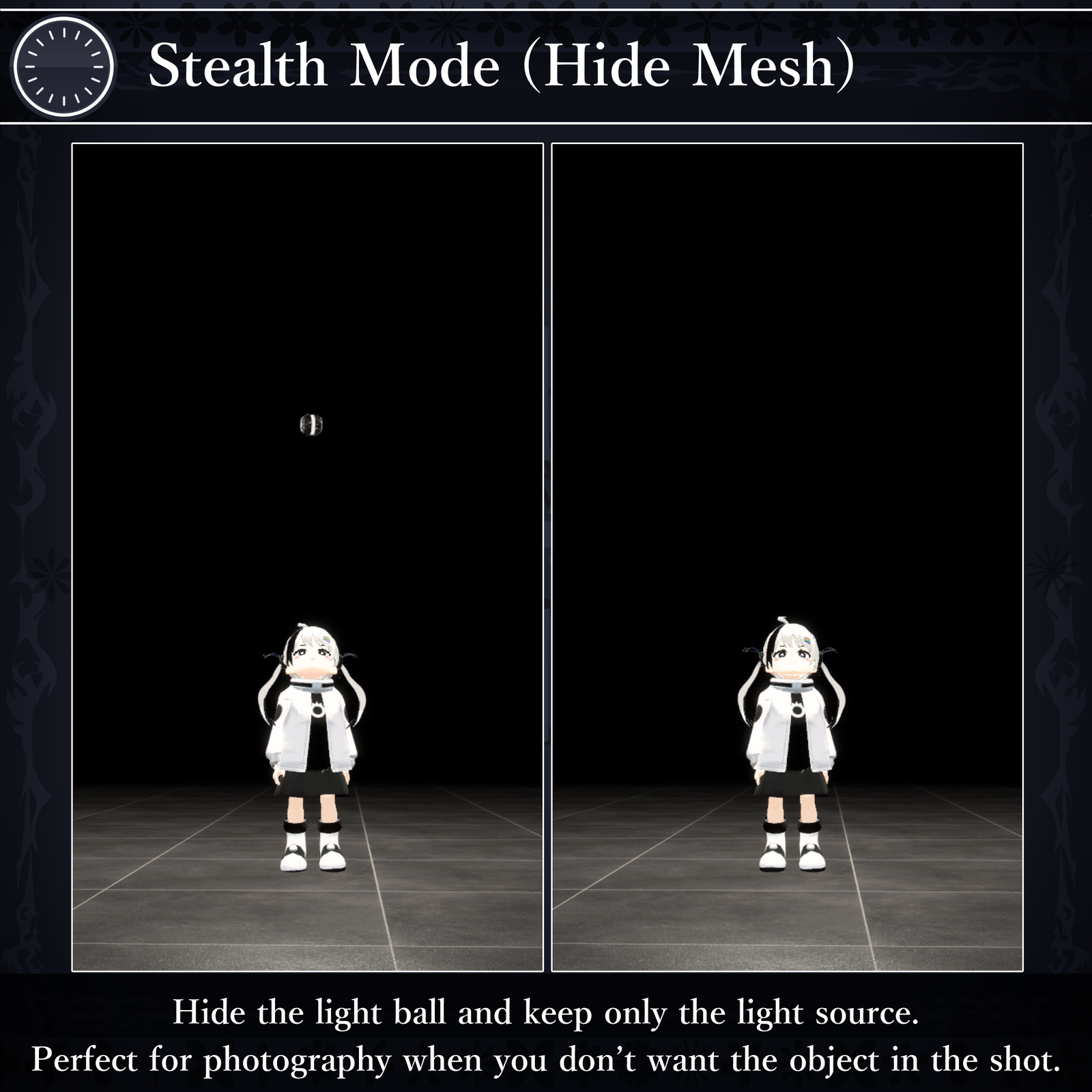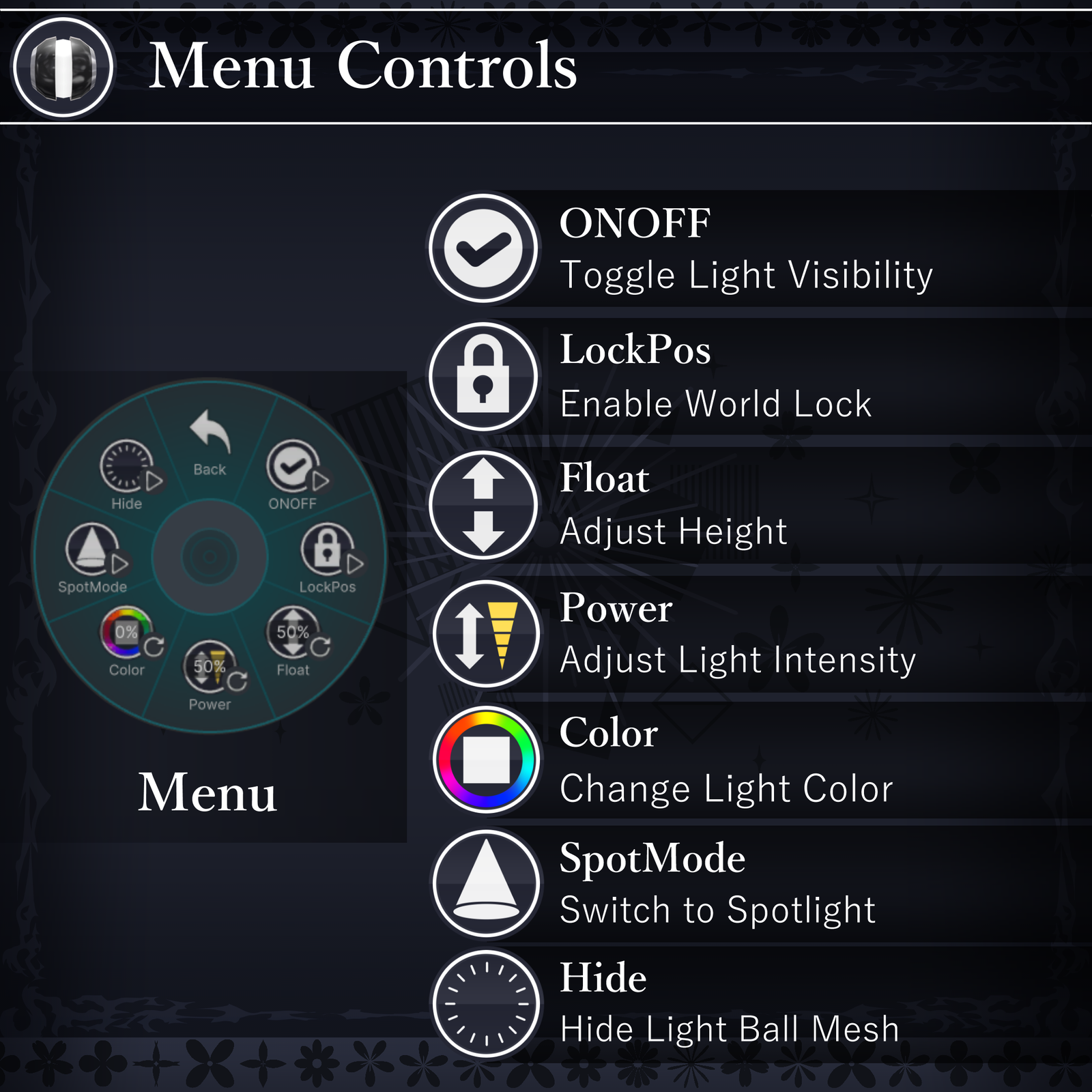 These features are controlled via the VRChat Expression Menu, allowing you to tweak various settings. Whether for photography, exploration, or any moment where light is needed—this orb will be your dependable partner.