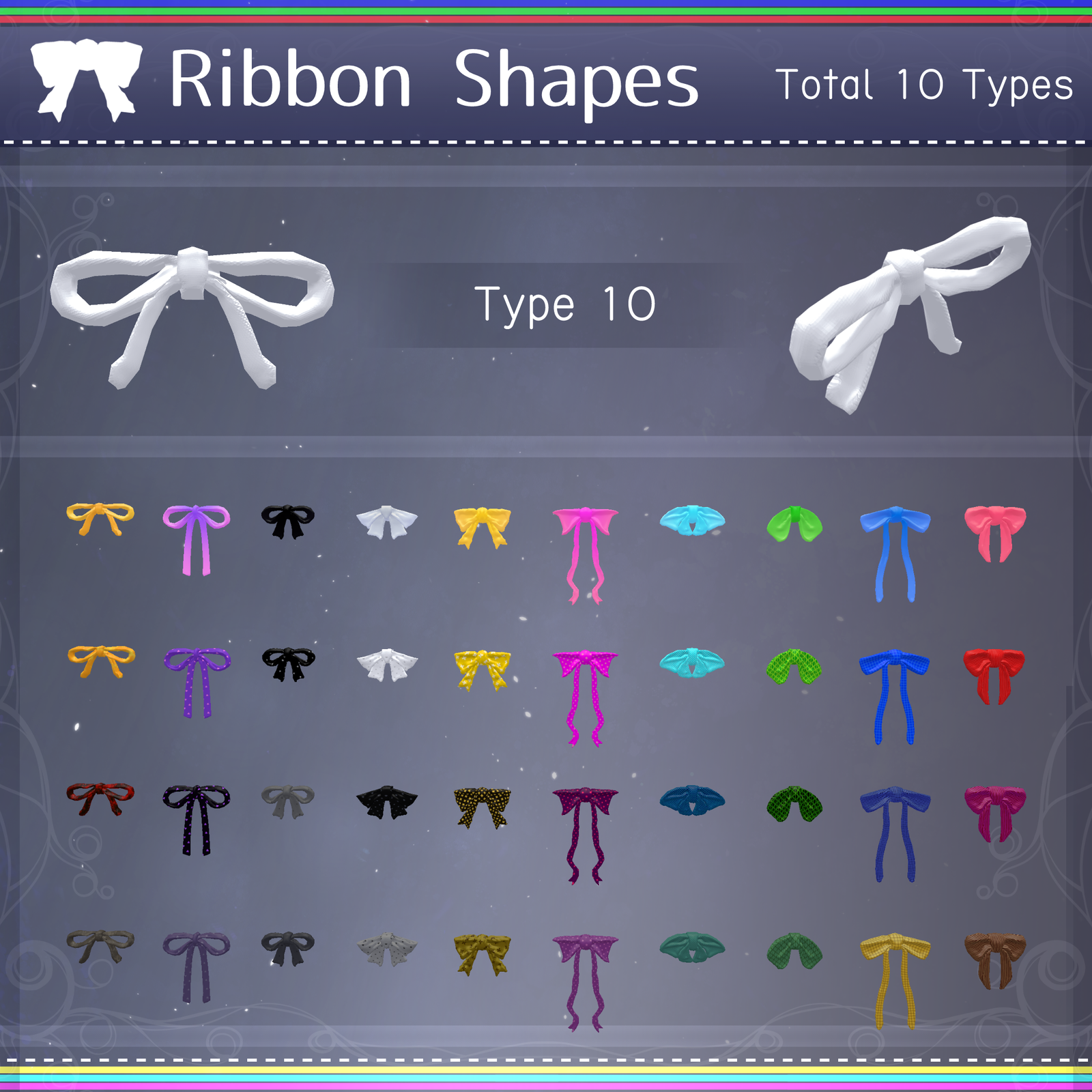 【Changing Colors and Materials】 To customize beyond the provided variations, creating an original material is recommended. Each ribbon requires a specific material containing its unique surface detail (Normal Map), so please check the ribbon's shape number first.