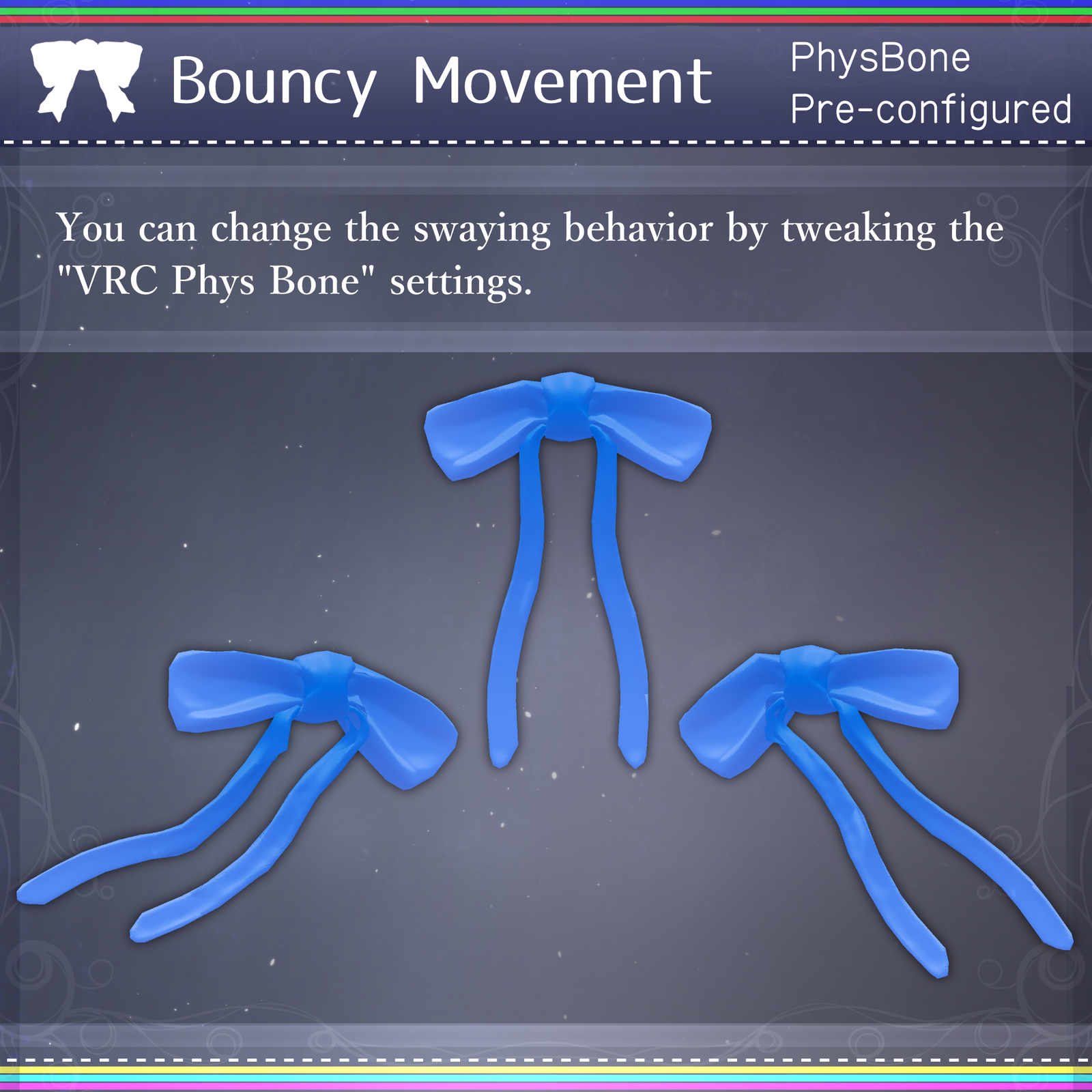 Pre-configured with PhysBones, the ribbons sway naturally with your every movement. Beyond the default setups, you can fully customize the look with your own textures or by tweaking the material settings.