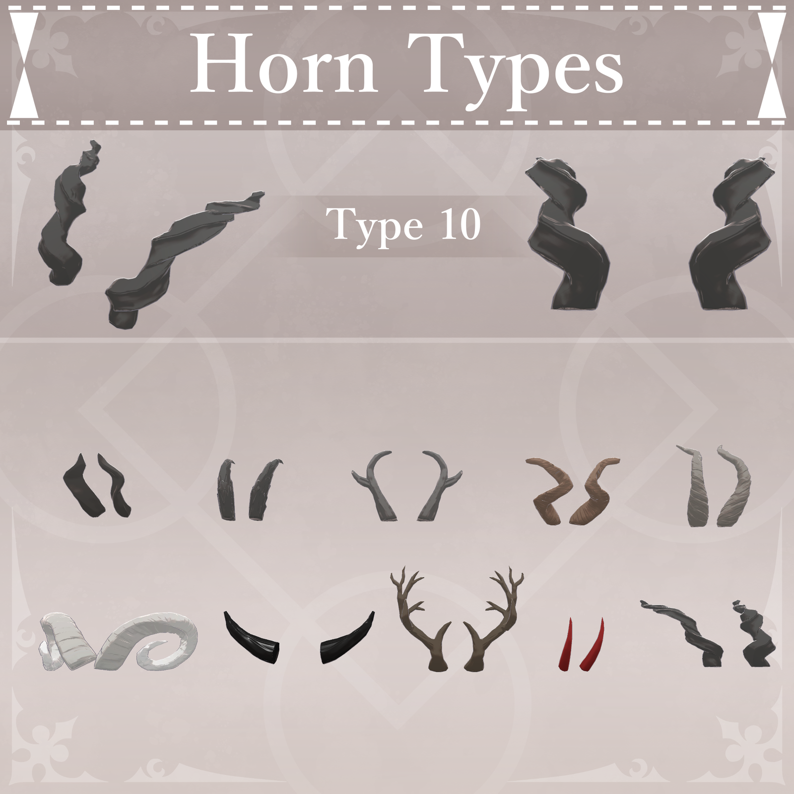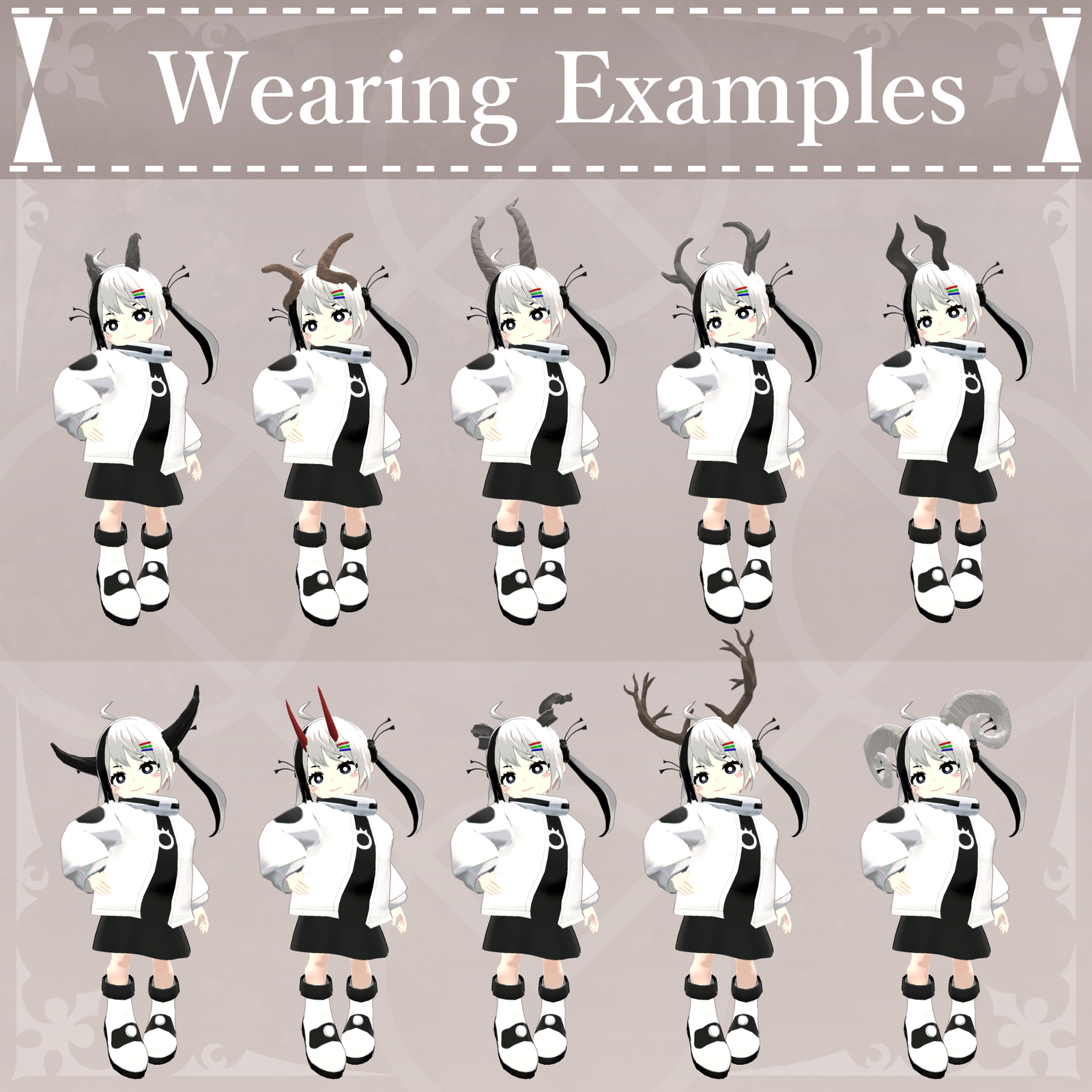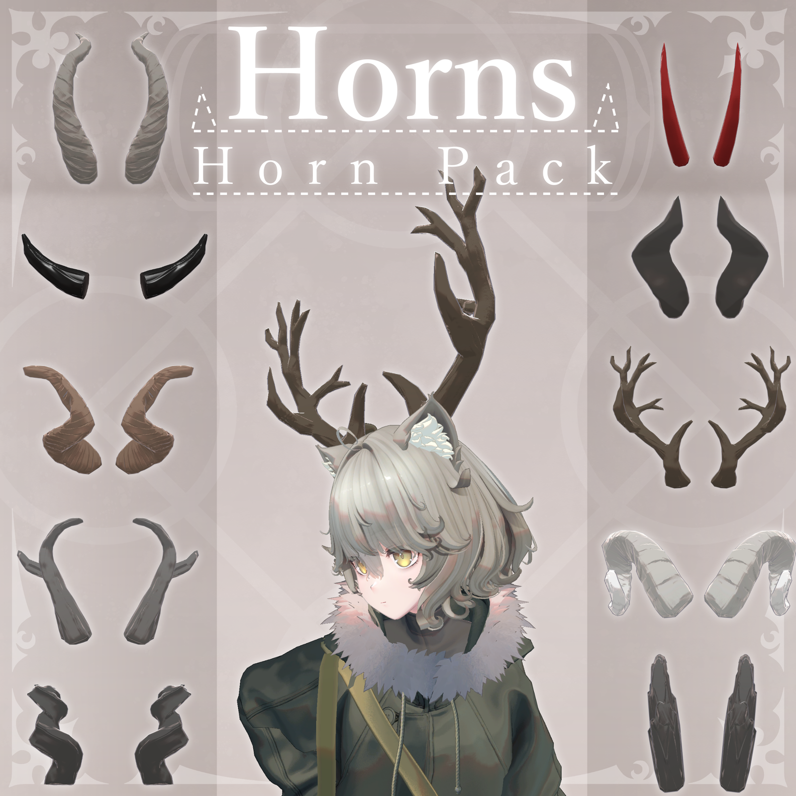 "HornPack" is a collection of horn accessories designed for VRChat. This pack features 10 different horn styles, allowing you to swap them out to suit your mood. It is compatible with Modular Avatar for a quick and easy setup.