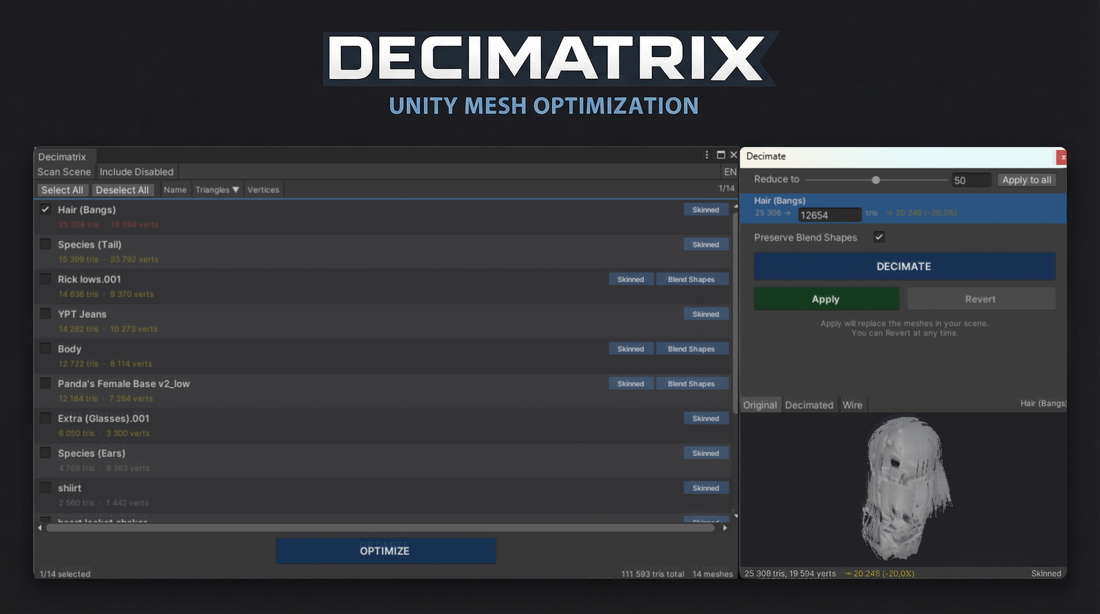 Decimatrix is a Unity tool that helps you reduce the complexity of 3D meshes in your scenes — making your projects run smoother and load faster, all without leaving the editor.