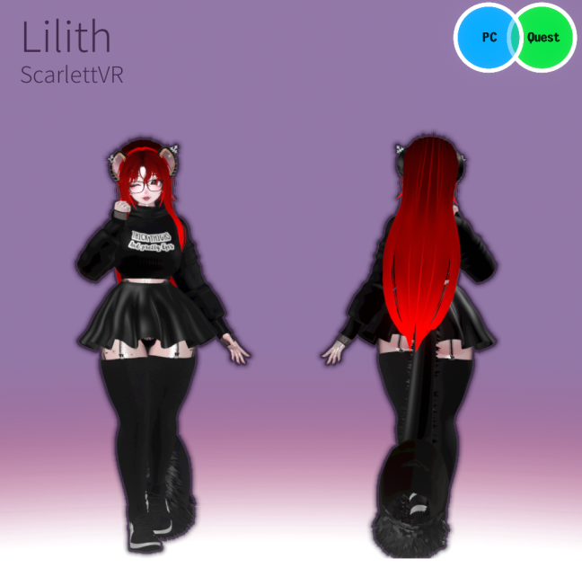 We are now welcomed to introduce to you LILITH BY SCARLETTVR!!! She is a long working avatar and i am so proud of her and myself that i can creat something thats cute, comfy, a little edgy, but super adorable. I hope you guys love her as much as i did. She was the best thing i can pour all my love into and i am super excited to have her for everyone!!