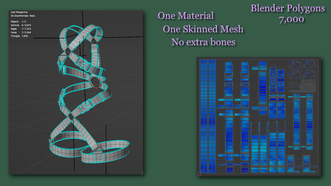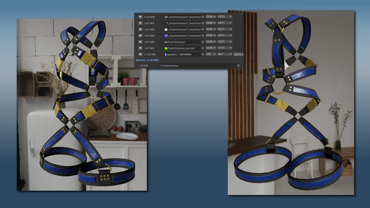 Each version comes with a clipping menu that lets you toggle off the upper and lower portions of the harness, and includes a couple of sliders for fitting over DD shirt and pants.