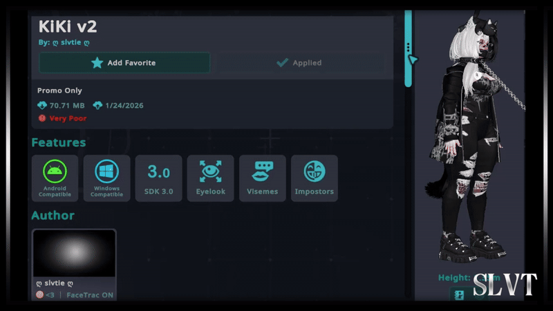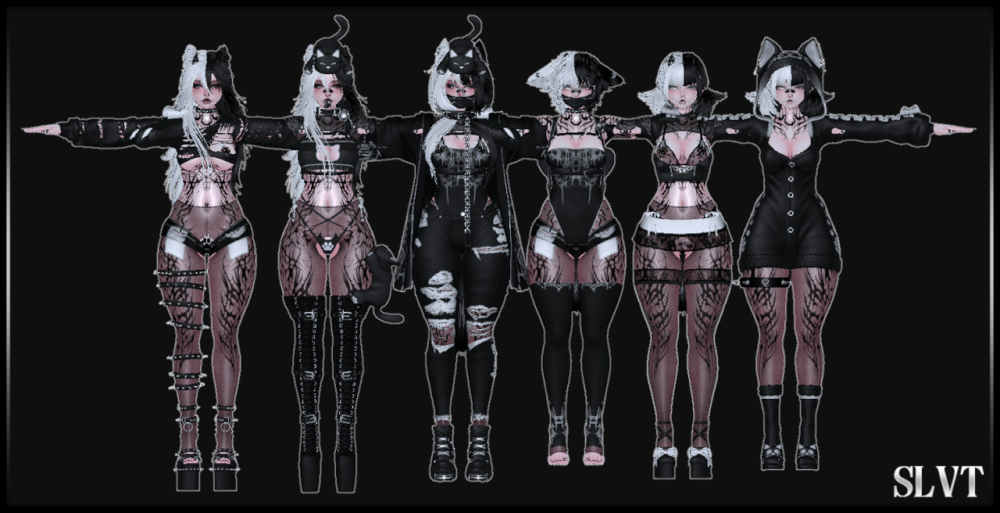 Pasties , Cat Ears , Cat Tail 2 , Arm Warmers , Bodysuit , Panties , Ripped Jeans , Baby Hair , Collar Hair , Collar Hair Bangs , Sneakers GogoLoco Beyond (VRCFury) , Head Swap , Hair Long / Bang Long , White → Pink toggle , Flatfoot toggle , Avatar idles (Blink / Twitches) skin tone , flatfood adjustments , heel foot adjustments , fake index.