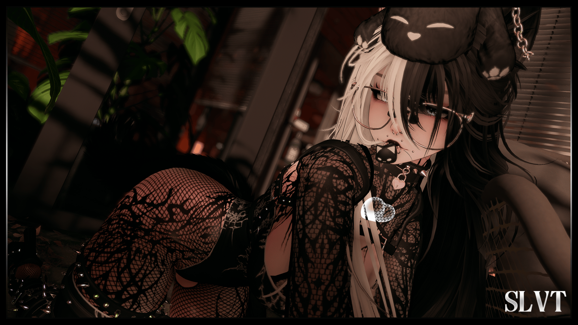 Face make up , body piercing , chained horns , kitten tail , kitten paws , kitten plushie , kitty mouth plushie , nails , fishnet , arm gloves , kitten panties , kitten top ,