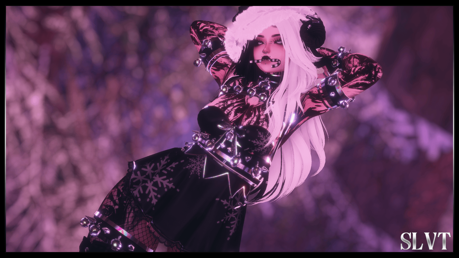 Face make up , candy cane , glasses , chest lights , thigh lights , booba piercing , santa hat , arm warmers , christmas sweater , body suit , skirt , hooves