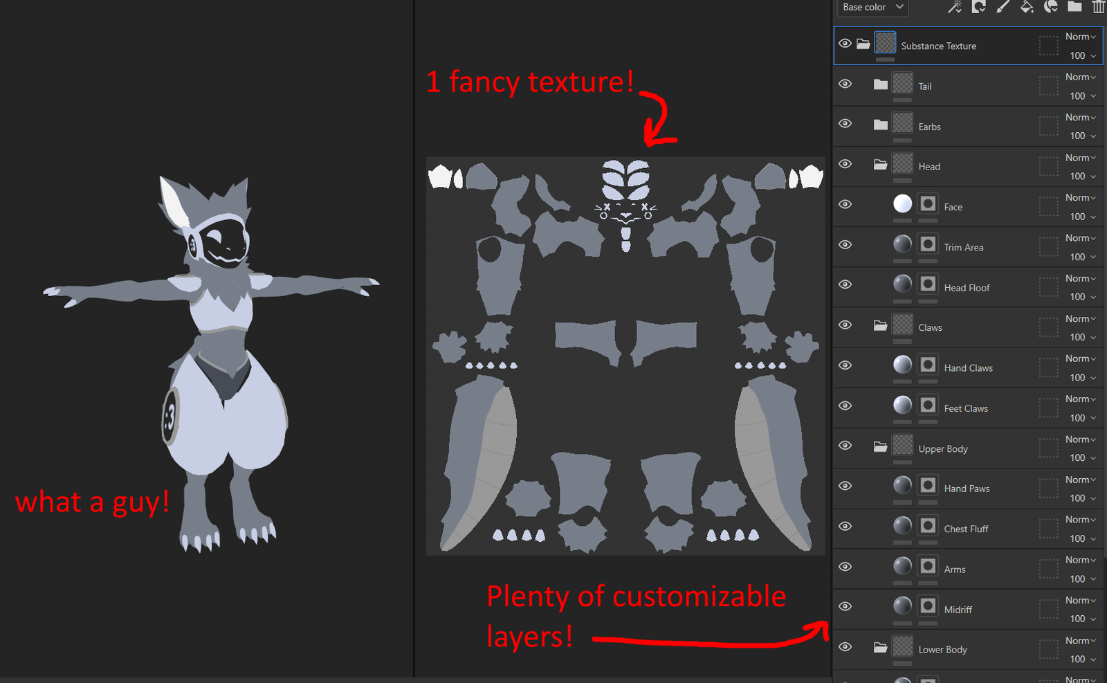 You'll get the substance file once you check out, this does NOT come with the base avatar, you'll have to buy that on either Gumroad, or Booth.