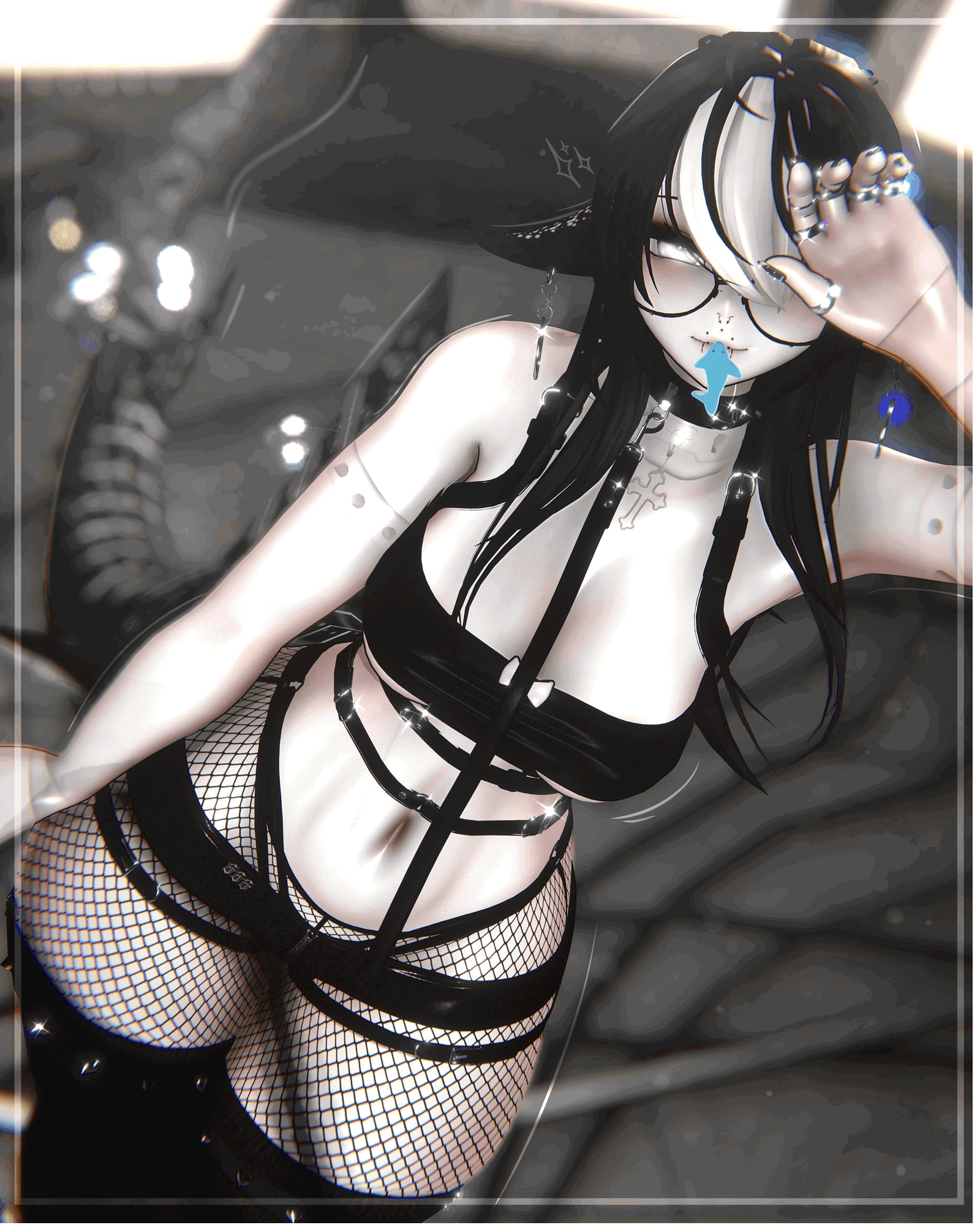 Accessories: Arm warmers, beret, bottom harness, can, choker, collar+leash, bandages, gag, glasses, round glasses, mask, rings, top harness, gummy shark, piercings