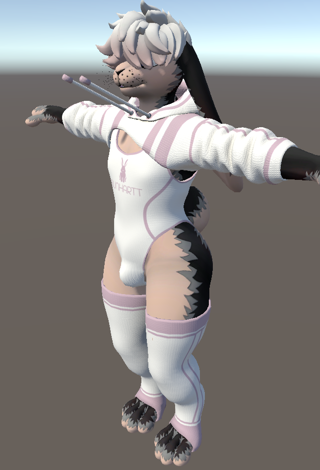 The outfit also comes with a cute bulge and physbones! It has some support for the NSFW breast sliders, but it tends to clip slightly at the massively large sizes!