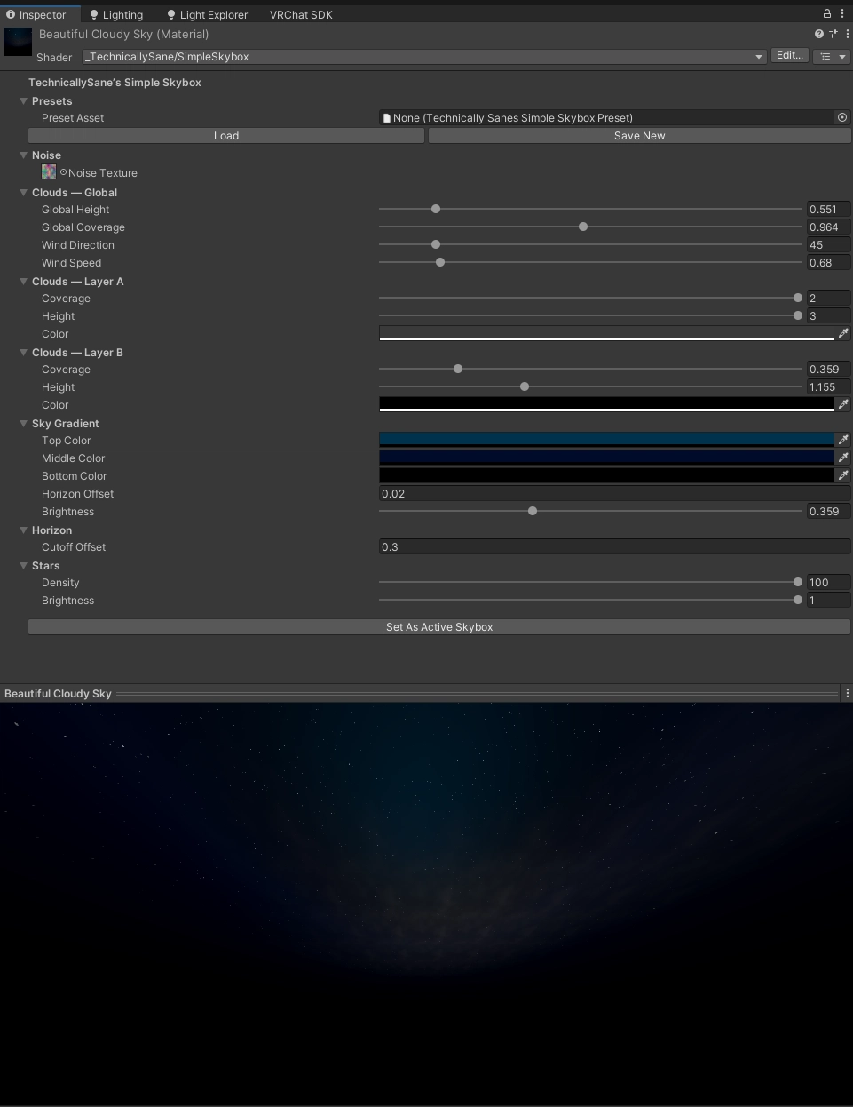 Includes a button in the shader to set as active skybox.