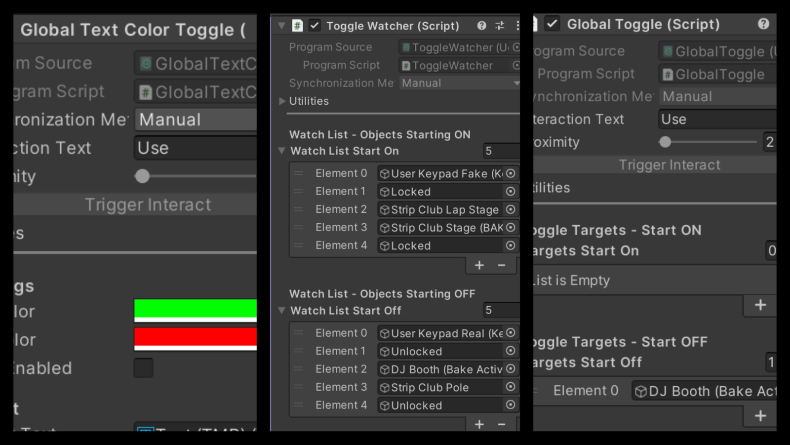 • TwiX_GlobalObjectToggle: Synced boolean to toggle assigned GameObjects for everyone in the current instance (instant updates for present users).